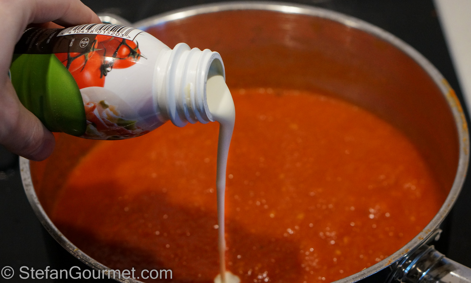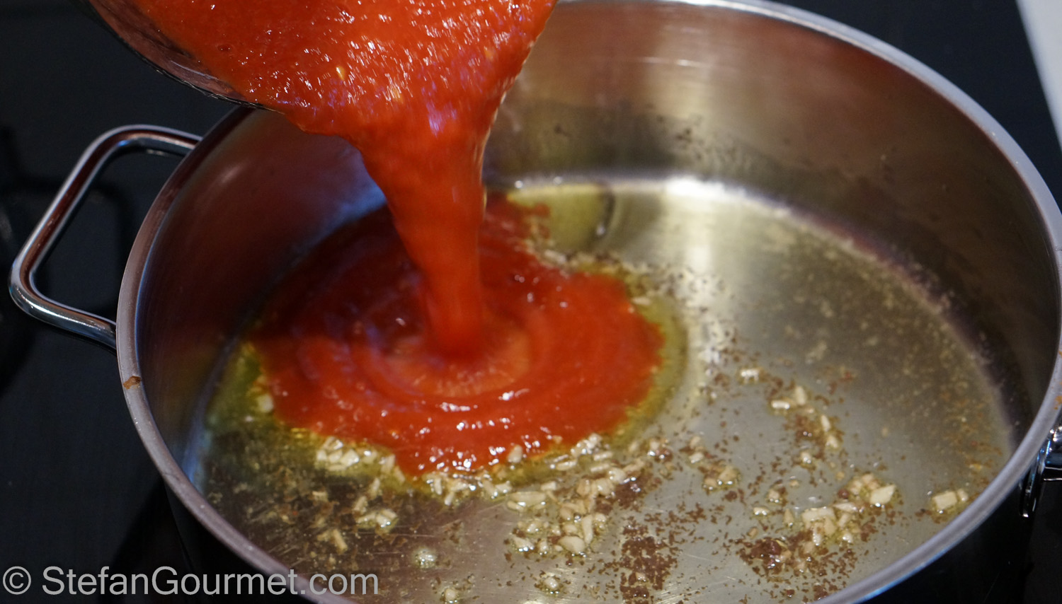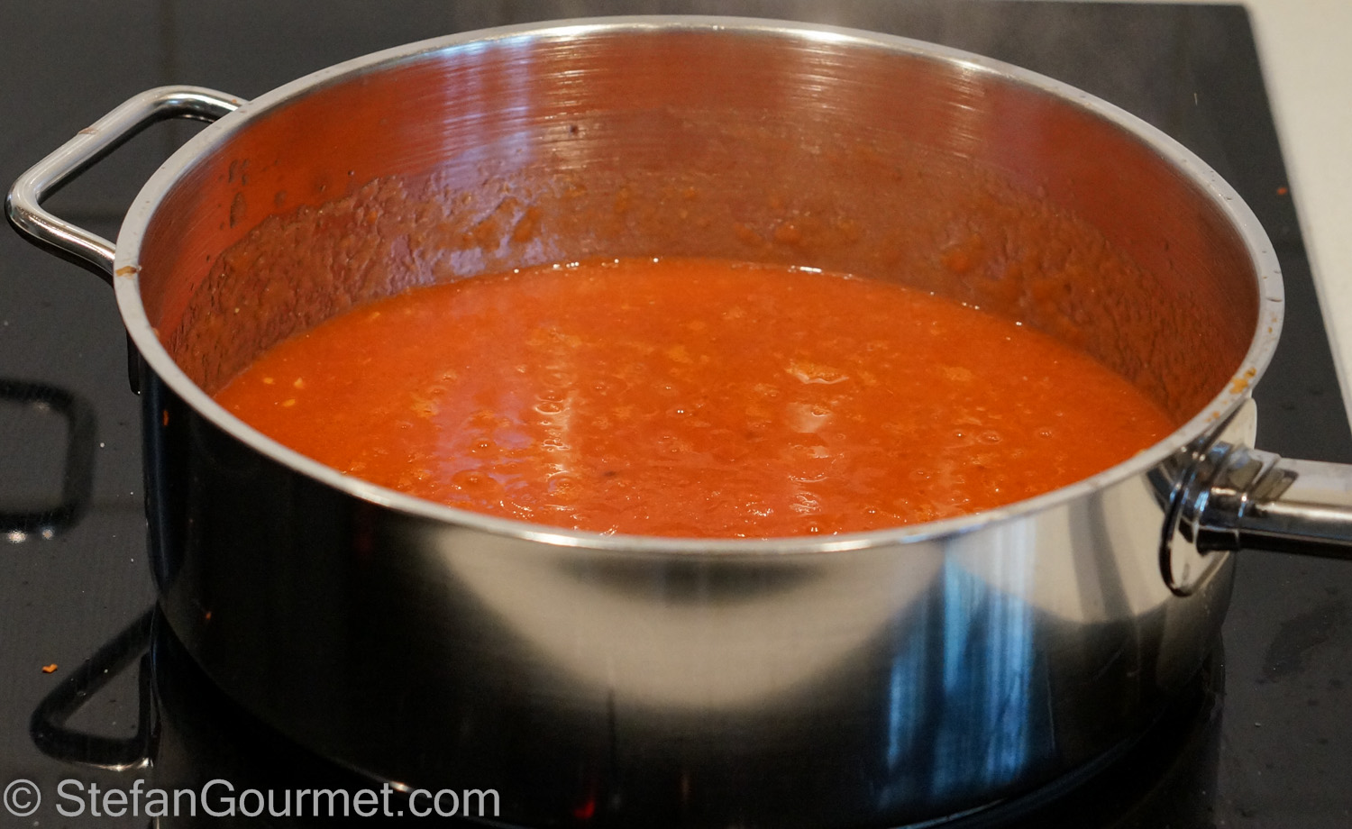 …stir and bring to a boil. Lower the heat and allow the tomato sauce to cook gently. Season with salt and chile pepper flakes.