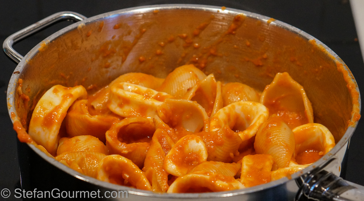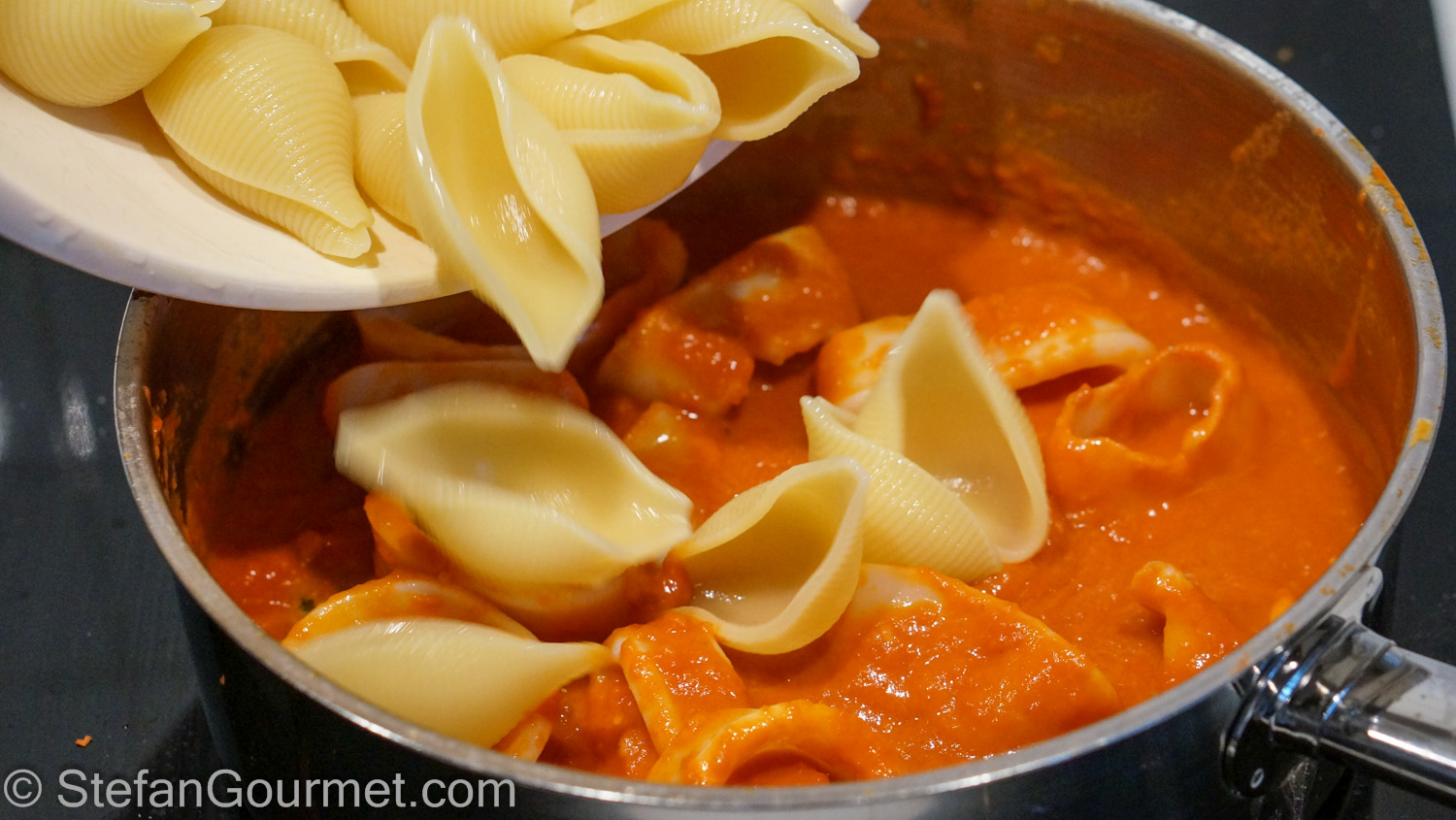Add the calamari to the sauce and stir. If you timed everything perfectly the pasta should now be cooked. If not, turn off the heat and only turn it back on to low heat when the pasta is cooked.