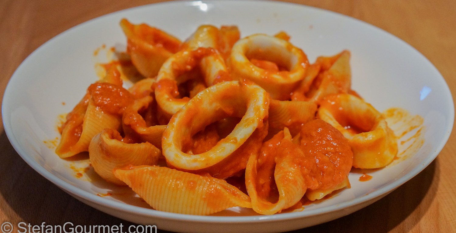 Yet another simple and delicious seafood pasta dish from Biba Caggiano that only takes as long as it takes to cook the pasta: pasta shells with calamari, tomatoes, anchovies, and chile pepper flakes. This is best with fresh squid, but frozen squid will work too. The most important is not to overcook the squid, as that would make it rubbery. The addition of a bit of butter and cream takes the ‘edge’ off the tomato sauce, and makes it work better with the squid.