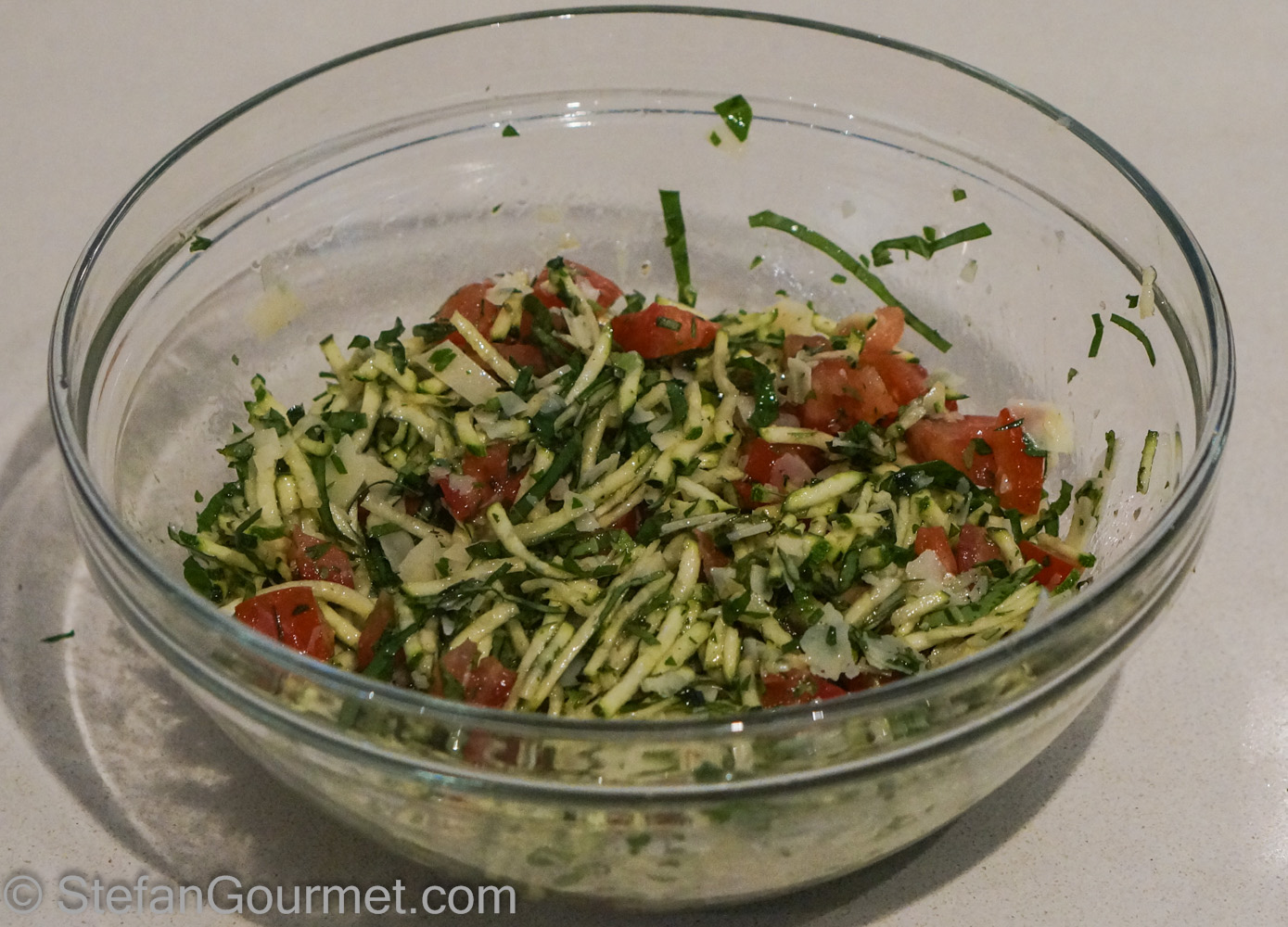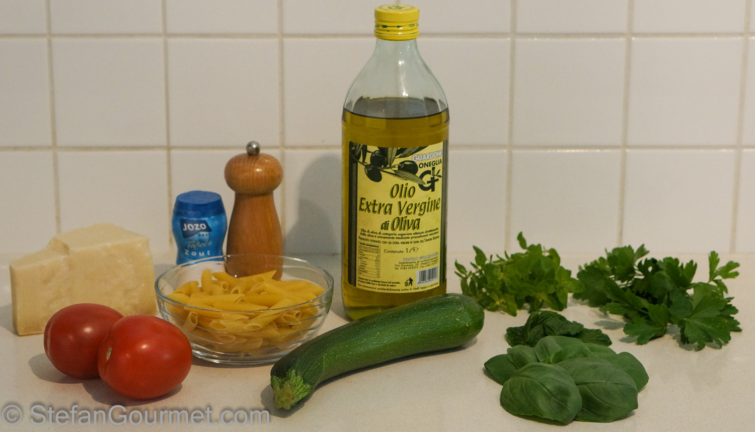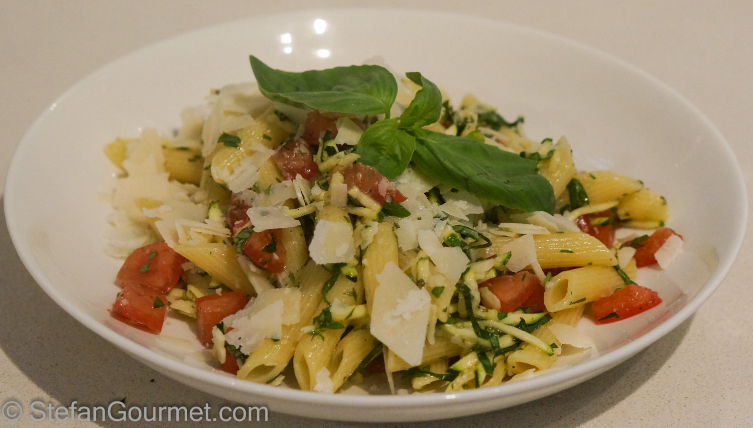 I got the idea for this fast delicious summery pasta dish from Marina of Le Recette di Baccos. It only takes as long as it takes to cook the pasta and the variations are endless. Raw vegetables, in this version zucchini and tomatoes, are combined with aromatic herbs and tossed with the cooked pasta with olive oil, salt, pepper, and parmigiano. It sounds simple, and it is, but it has great flavor and it is perfect for summer. Grazie, Marina!