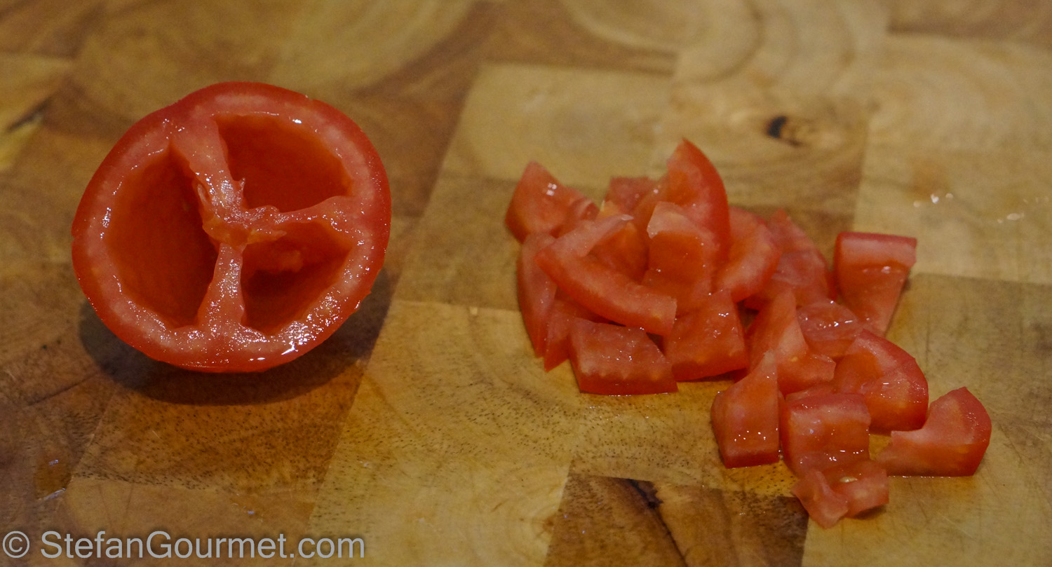 Meanwhile, remove the seeds from the tomatoes and dice.
