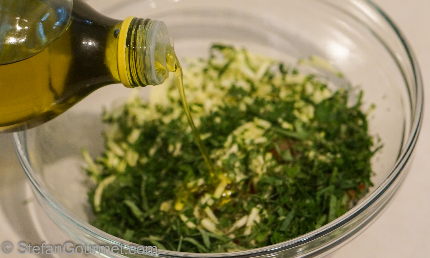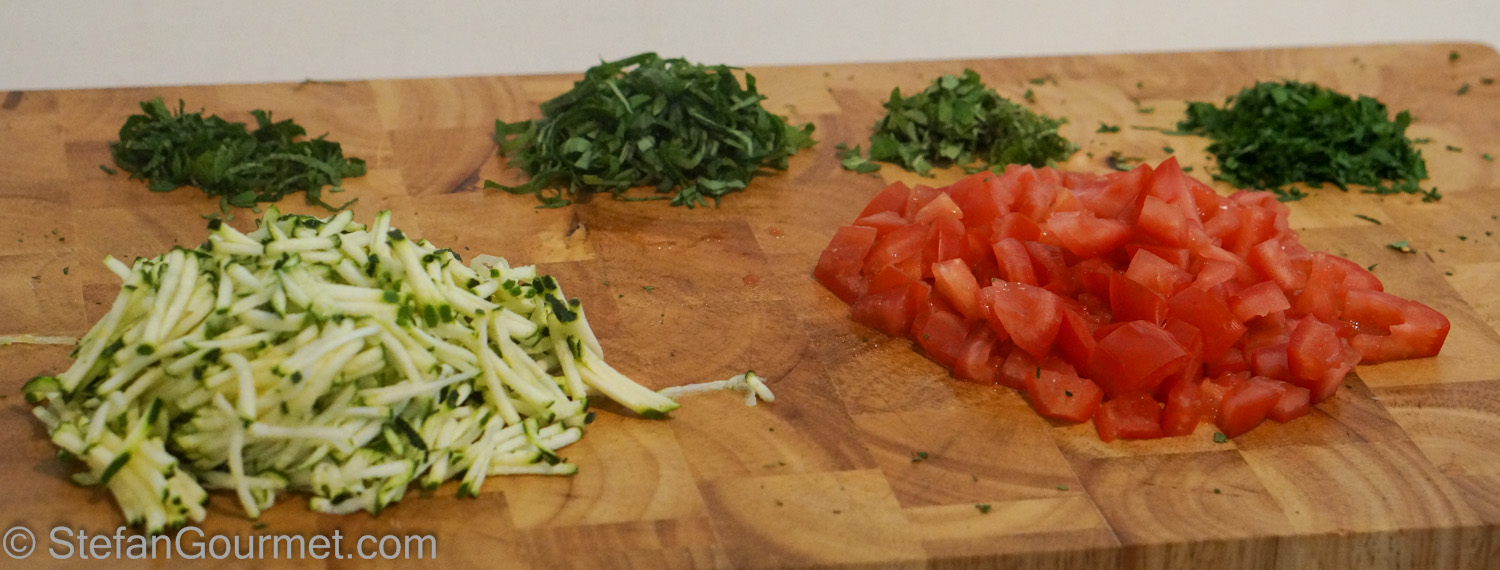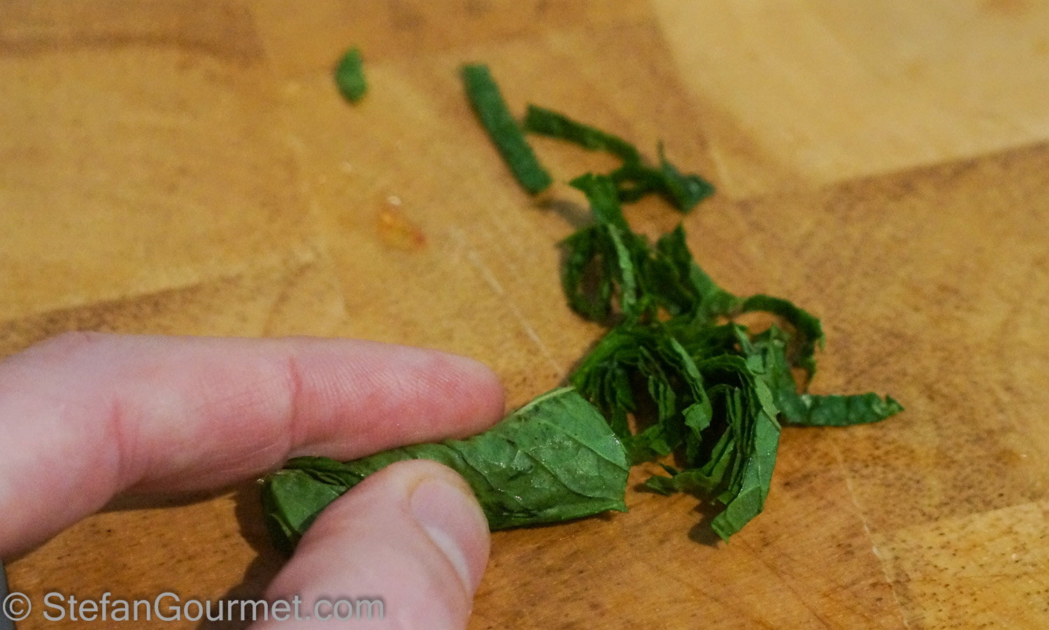 Cut basil and mint in chiffonade (stack the leaves, roll them up, and cut into thin strips). Mince the parsley and oregano. (Mincing basil and mint is not a good idea, because they will bruise and lose too much of their aroma.)