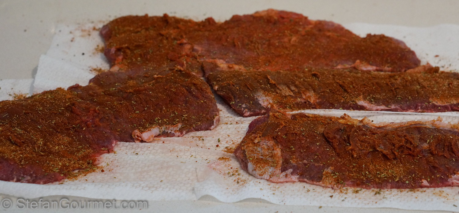 When I first tried skirt steak sous-vide, I had cooked it only 24 hours and it was still tough. I think you could cook it even for 72 hours if you like it extremely tender. As for the spice mix, of course you can adjust that to your own taste. For instance, I used smoked paprika and New Mexico chile powder (courtesy of Baby Lady). If you like it more smoky, you could replace the chile powder with chipotle powder. Or if you like it less smoky, replace the smoked paprika with regular paprika.