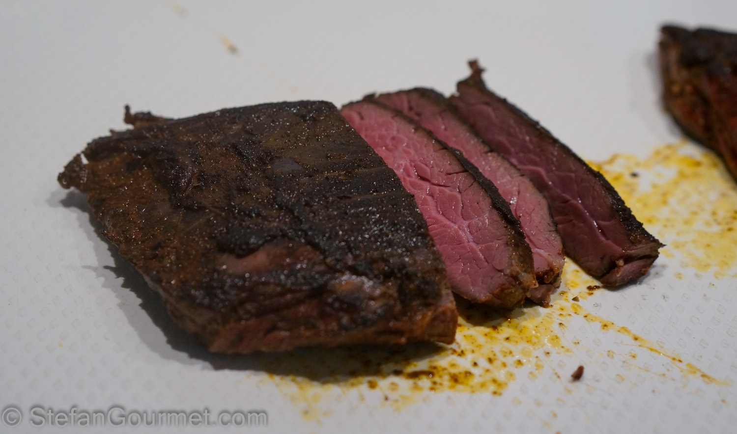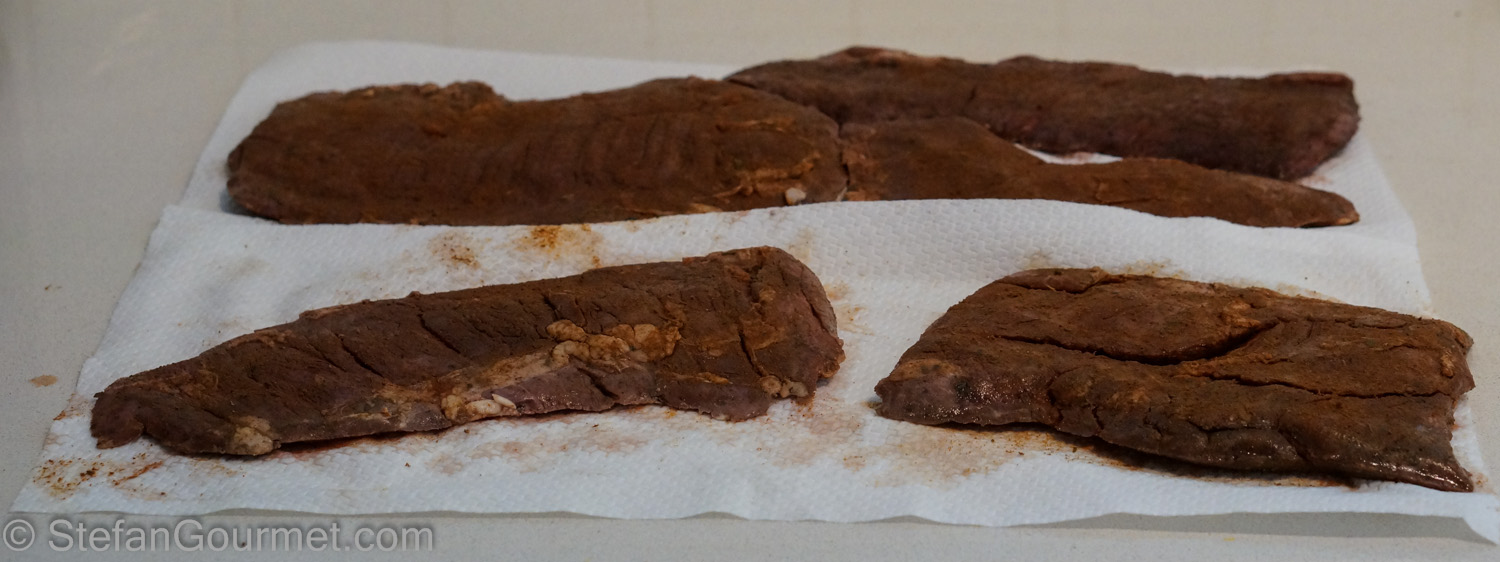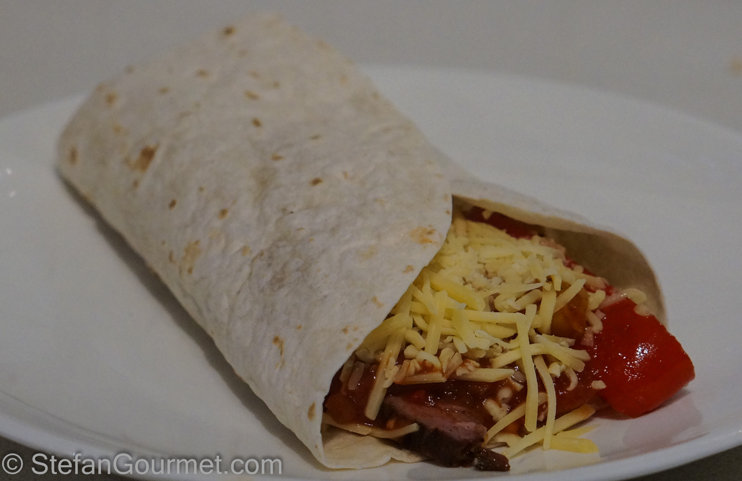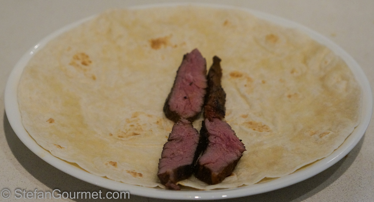 We love fajitas, Tex-Mex flour tortillas stuffed with chicken or steak, bell peppers, onions, salsa, and cheese. At least that’s how I like to prepare them. We usually have them with chicken, but I was curious to try them with steak. Skirt steak is sometimes also known as ‘fajita meat’, and so that was the cut of beef I wanted to use. Skirt steak is from the diaphragm of the cattle. It is very flavorsome meat with a coarse structure, and can be tough if you don’t slice it very thinly across the grain. For a special treat I cooked the skirt steak sous-vide for 48 hours at 55C/131F and then finished it on the grill. This made the beef tender and juicy, and still pink medium rare all the way through. I think the photo above speaks for itself. It also gave the fajita spices the opportunity to penetrate deeply into the meat. The result was absolutely delicious and this is something I’ll definitely make again.