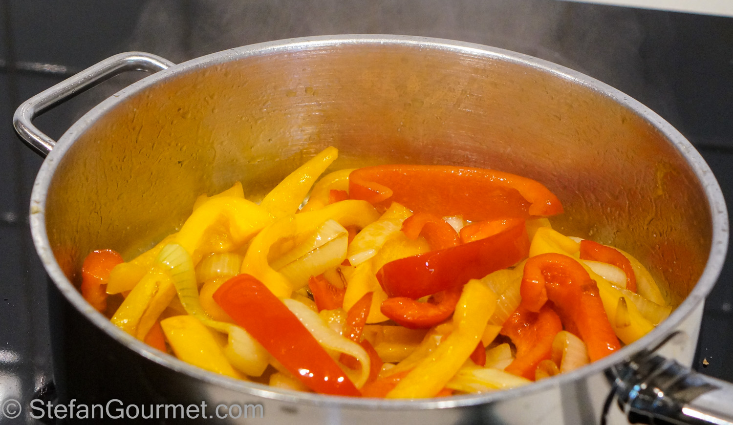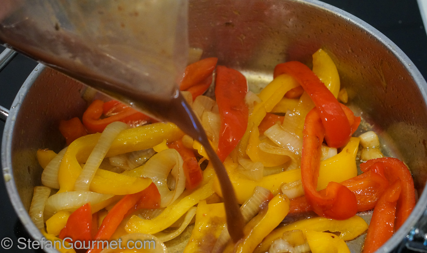 Now for a beefy and spicy flavor kick, add the juices from the sous-vide pouch to the bell peppers and onions, and cook until most of the liquid has disappeared.