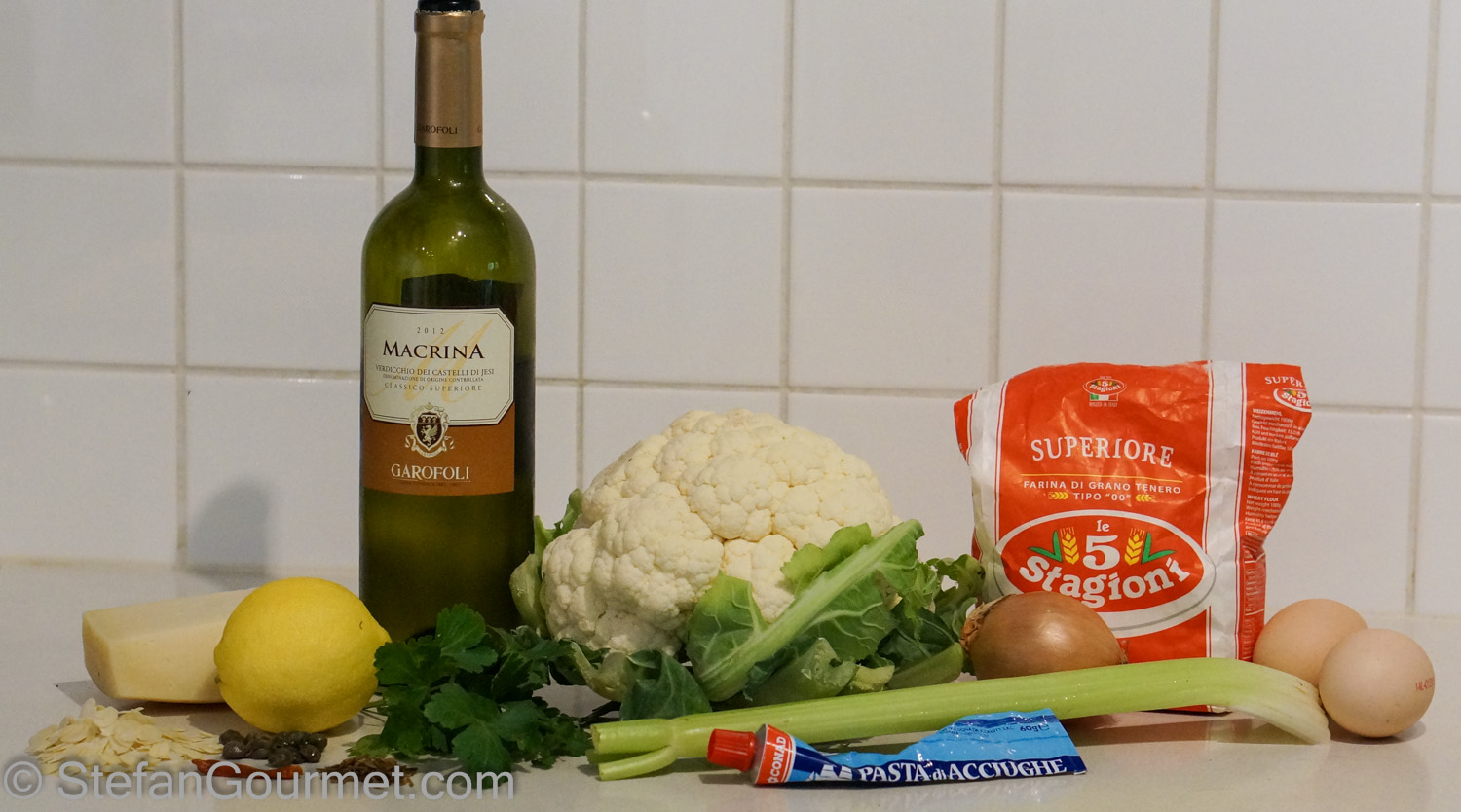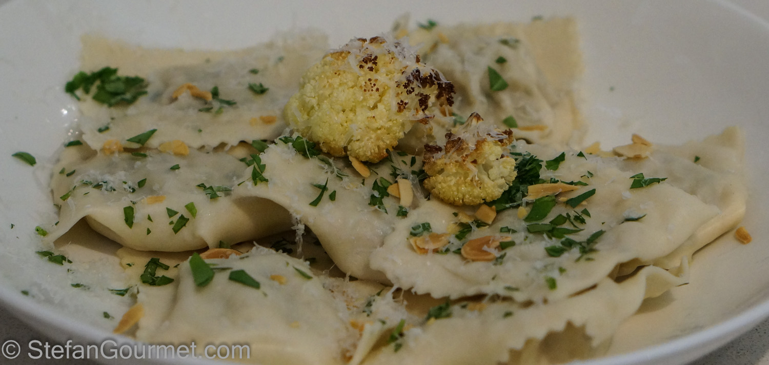 When I made my first batch of ravioli with a cauliflower stuffing some weeks ago, I contemplated whether I would make it with red wine or with white wine and ended up making a delicious red wine version with great depth of flavor. The idea of a ‘fresher’ version with white wine and lemon lingered, and so I decided to make that one as well. The result was equally delicious, but lighter and fresher. Both cauliflower ravioli recipes are great, it depends on what type of flavor you’re looking for and what wine (red or wine) you’d like to drink with them. The technique is the same: braising the cauliflower gives these ravioli great depth of flavor. The trick is to balance the other ingredients such that they blend into one flavor with the cauliflower rather than tasting the individual elements.