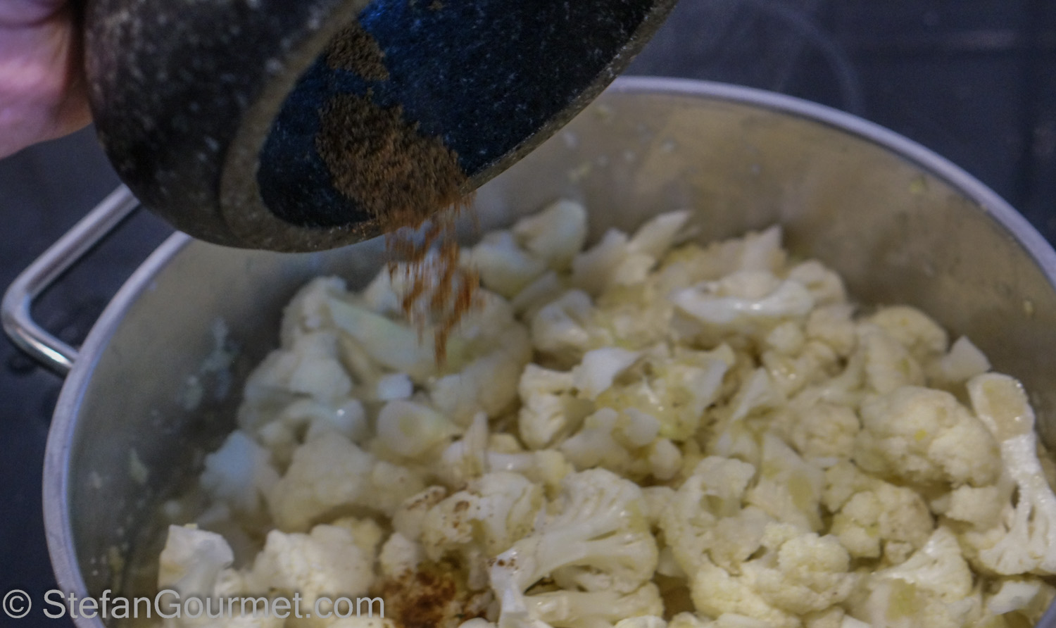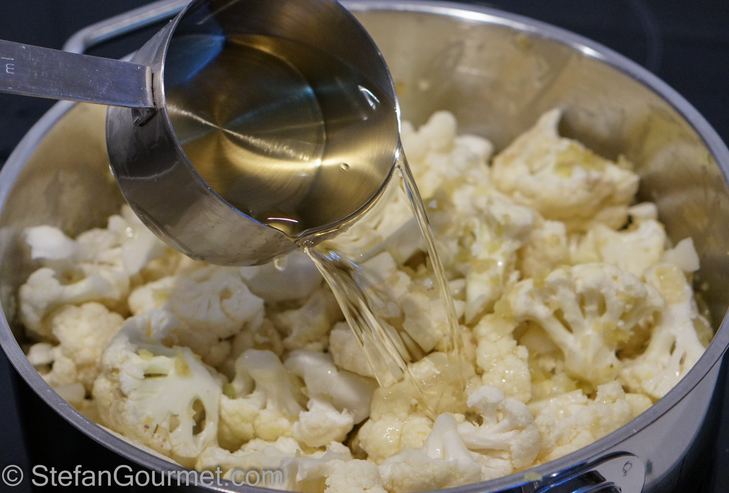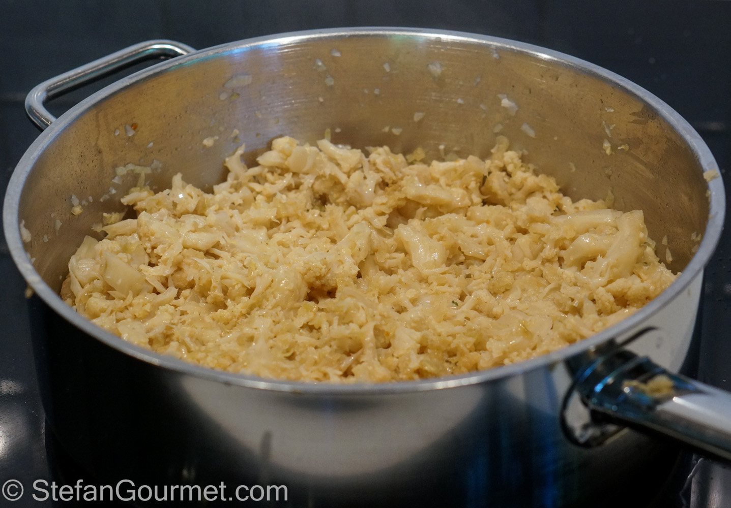 Cover and allow to simmer for at least an hour over low heat, stirring now and then. Add only a bit of water or white wine when absolutely necessary. It is fine if the cauliflower browns just a little, but it should not burn.