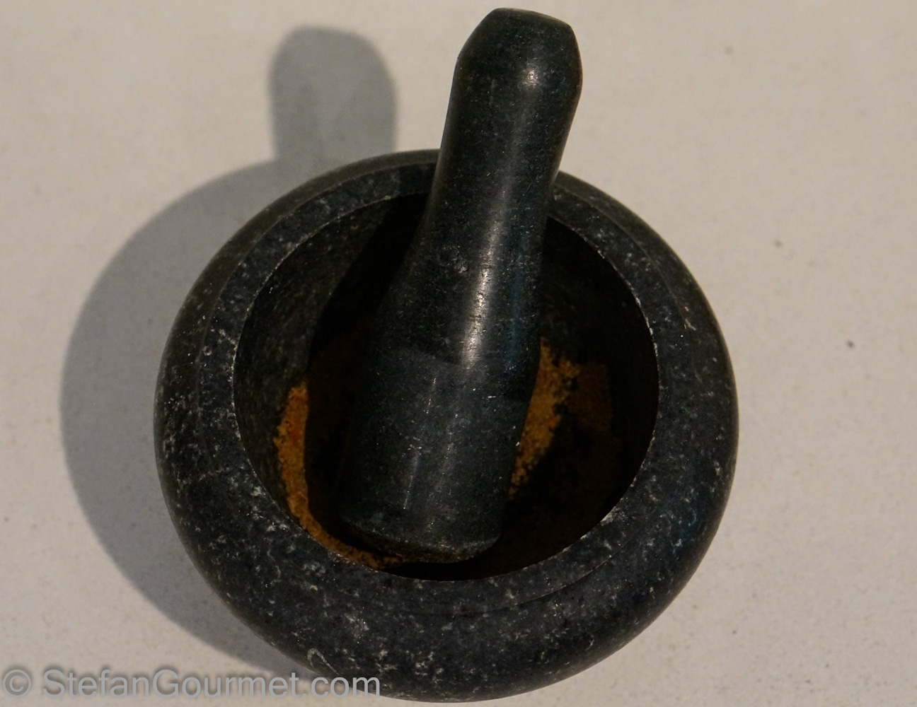 Put the cumin seeds and crumbled dried chile pepper (without the seeds) in a mortar.