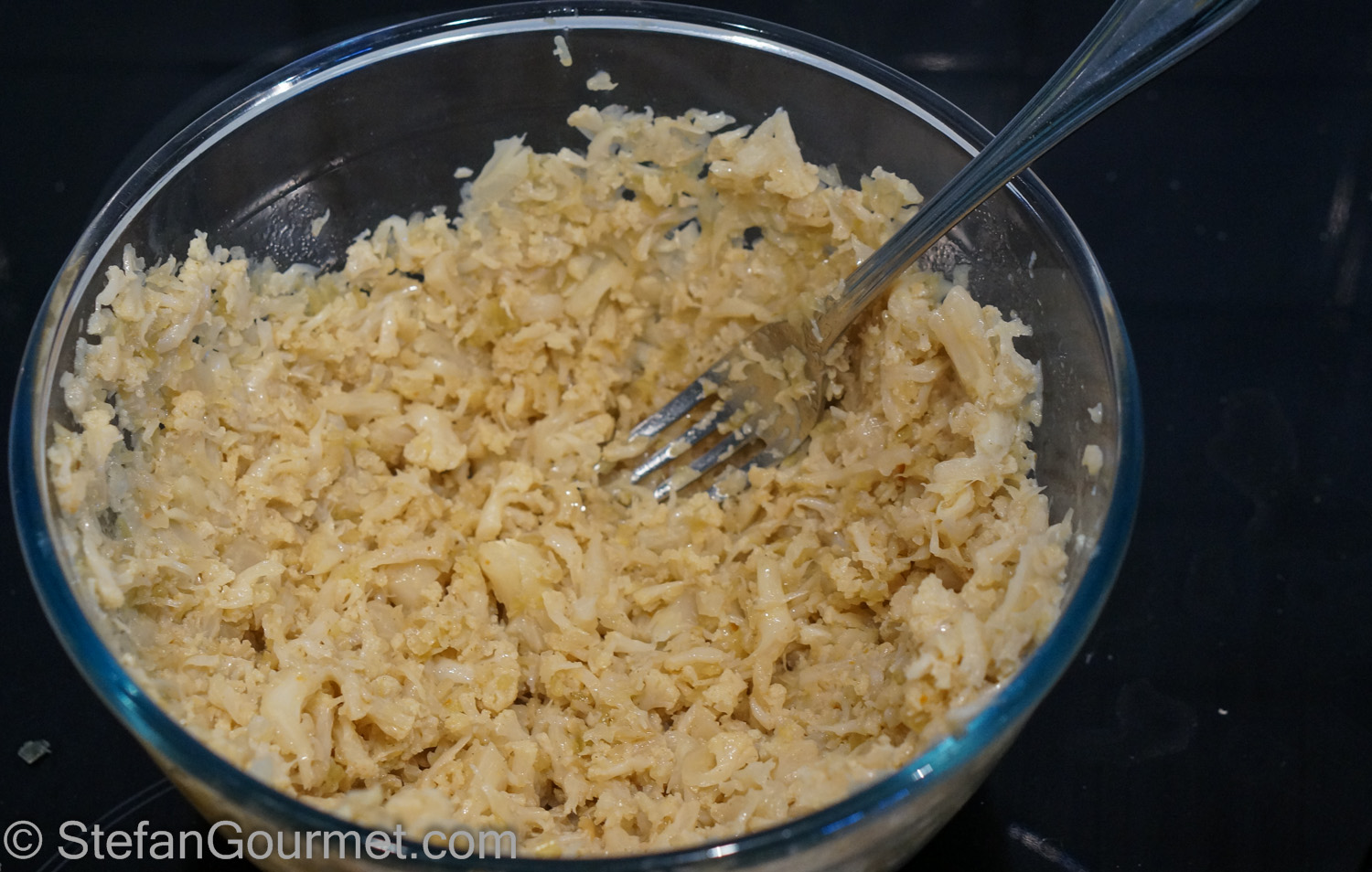 As soon as the cauliflower is ready, transfer it to a bowl and mash it with a fork.