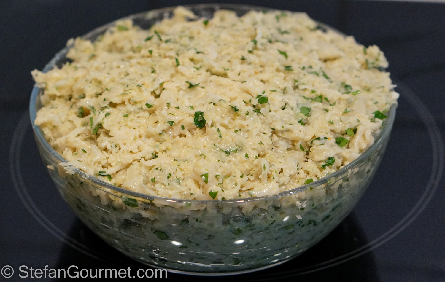 Add most of the parsley and stir to mix. Taste and adjust the seasoning. The stuffing should taste slightly overseasoned. You could add some more ground cumin or cayenne pepper, but be careful not to disturb the balance of flavors. Cover the bowl with plastic wrap and refrigerate to allow the stuffing to firm up.