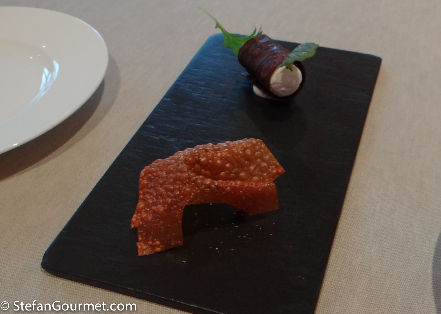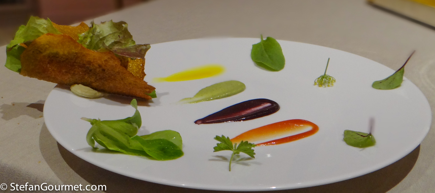A crispy potato taco stuffed with tender and juicy red mullet, served with four different sauces. Technically very difficult, creative, as well as delicious. 10/10