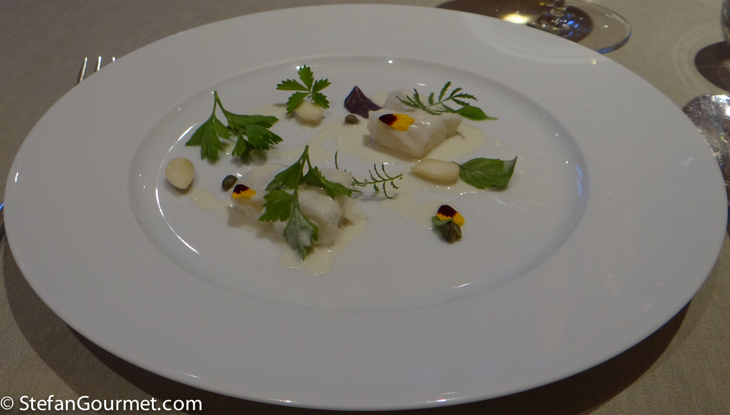 The cod in the second course, Almond and Cod, was cooked sous-vide and unbelievably tender without being dry. From personal experience I know that the hardest part of this dish must be to serve the cod without letting it fall apart. The combination with fresh almond was nice. 9/10 The cataratto was a bit too strong for the dish, but otherwise okay as a wine pairing.