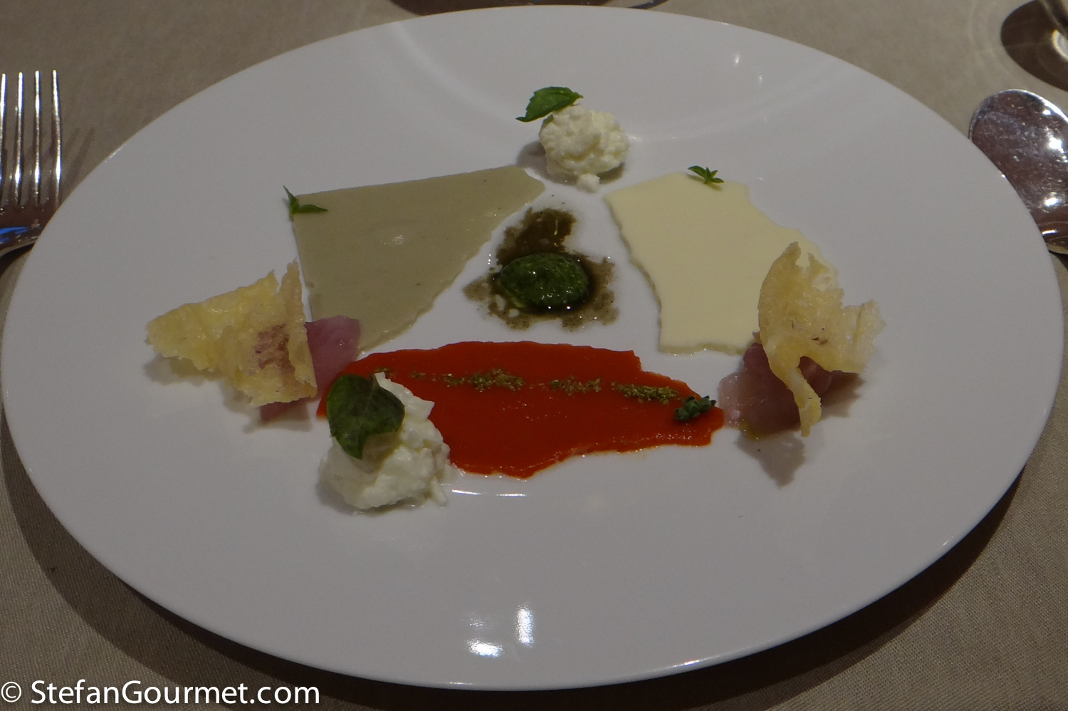 For the wine there are different percorsi on offer: 4, 5 or 6 glasses, just from Piemonte or also from ‘everywhere else’. With 6 glasses and 11 courses we could foresee a difficult wine pairing, and so we asked the sommelier to see if he could include more different wines for us. There was some misunderstanding, as what he ended up doing was giving us each a different wine in 3 of the 6 cases. This was nice, as we could sip from each other’s glasses to see which one worked better with the food.