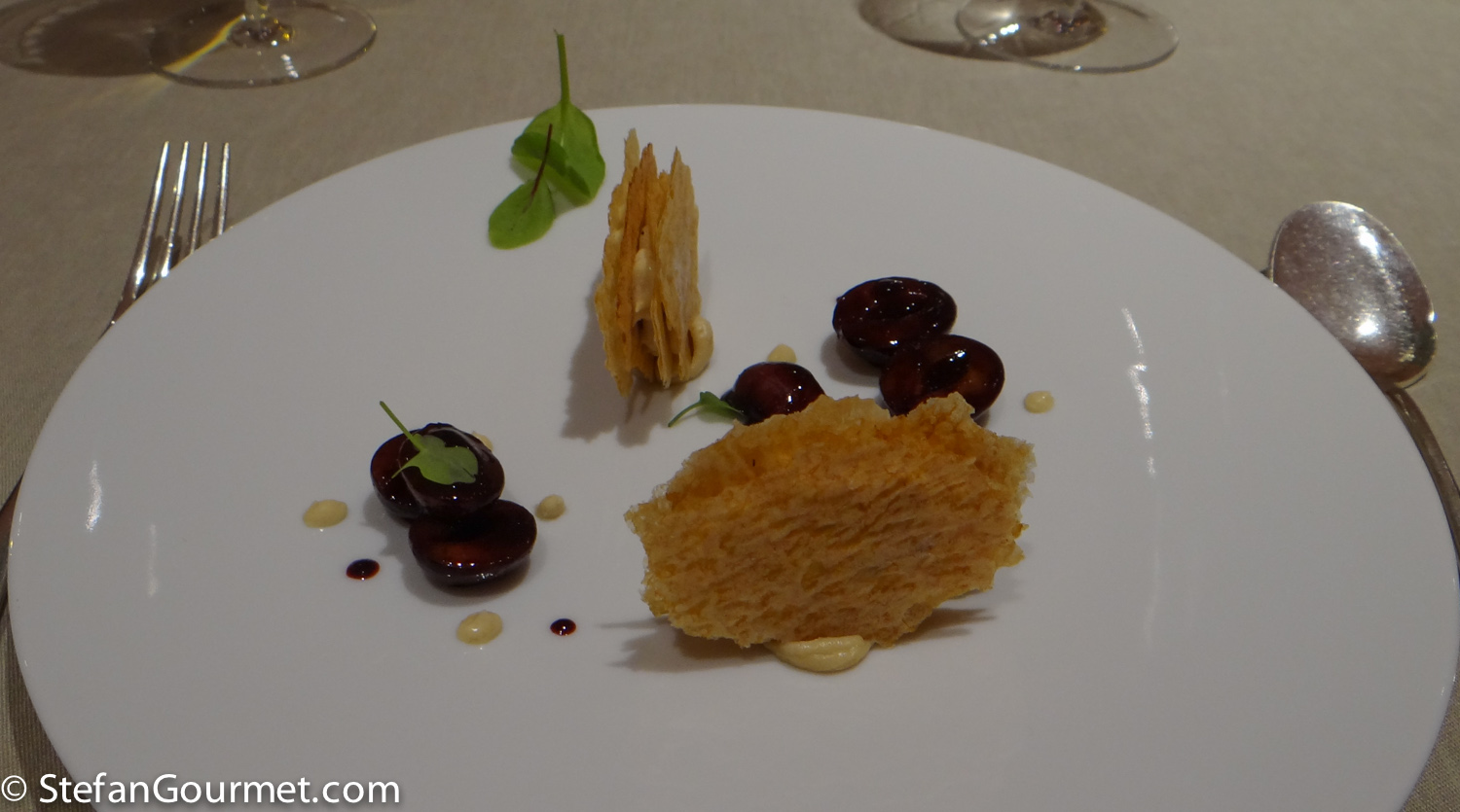 The dessert was very original: crispy potato with peanuts and plums. Very original taste, but a bit heavy. 9/10 The pairing with a Moscato Passito was slightly better than with a Sauternes.