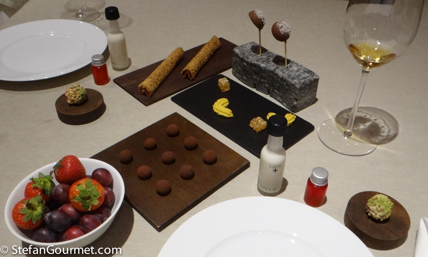 As for the wine pairings, I expected that using a single wine for multiple courses would be problematic, but in fact those wine pairings were okay. The two reds that were served with a single course each, were not as nice. One wine even clashed, which seems to indicate that the chef and/or sommelier have never actually tasted the combination themselves. The sommelier didn’t seem to be interested in whether we liked the wine pairings or not. Although we’ve been starting to get used to substandard wine pairings in Italy, our experience at Vissani showed that also in Italy it is possible to serve wines that actually complement the food. It was nice though that the sommelier on our request served two different wines that we could compare for half the glasses in the ‘percorso’.