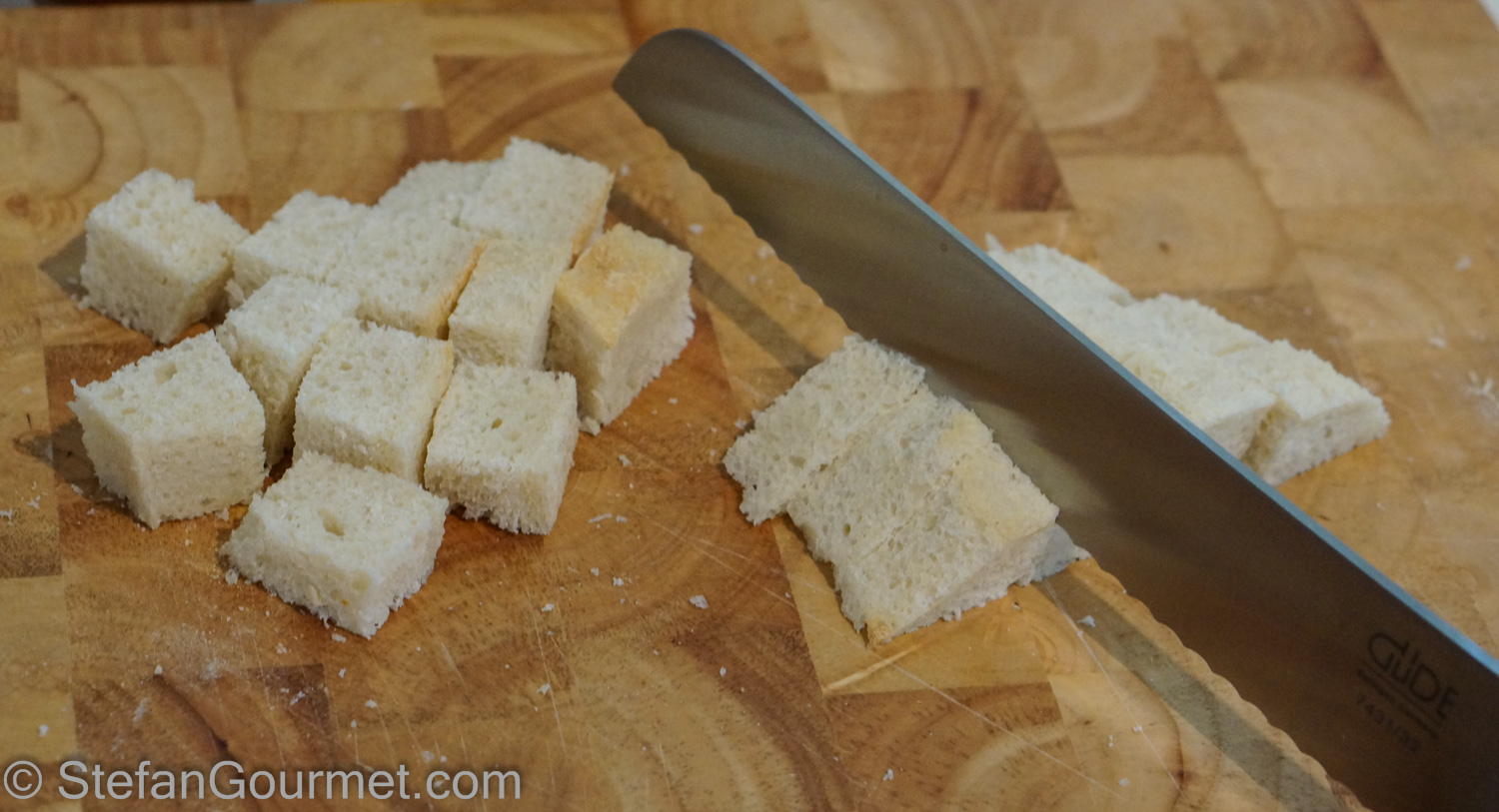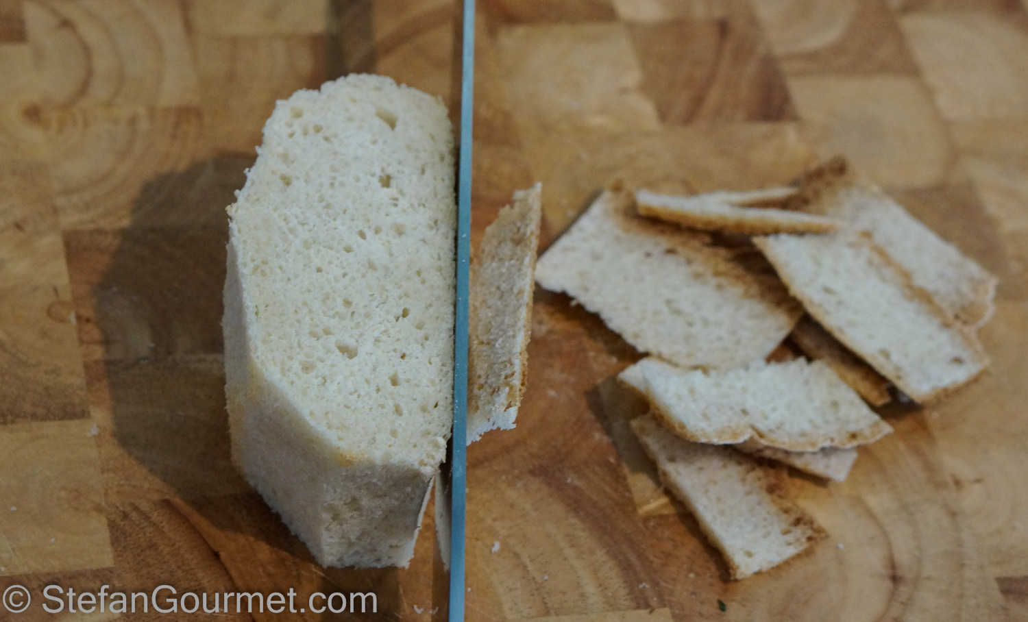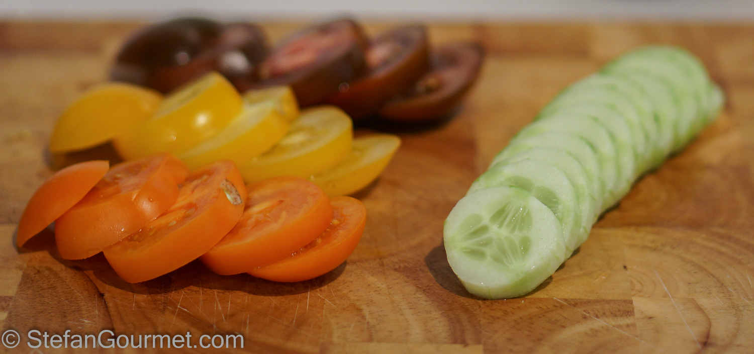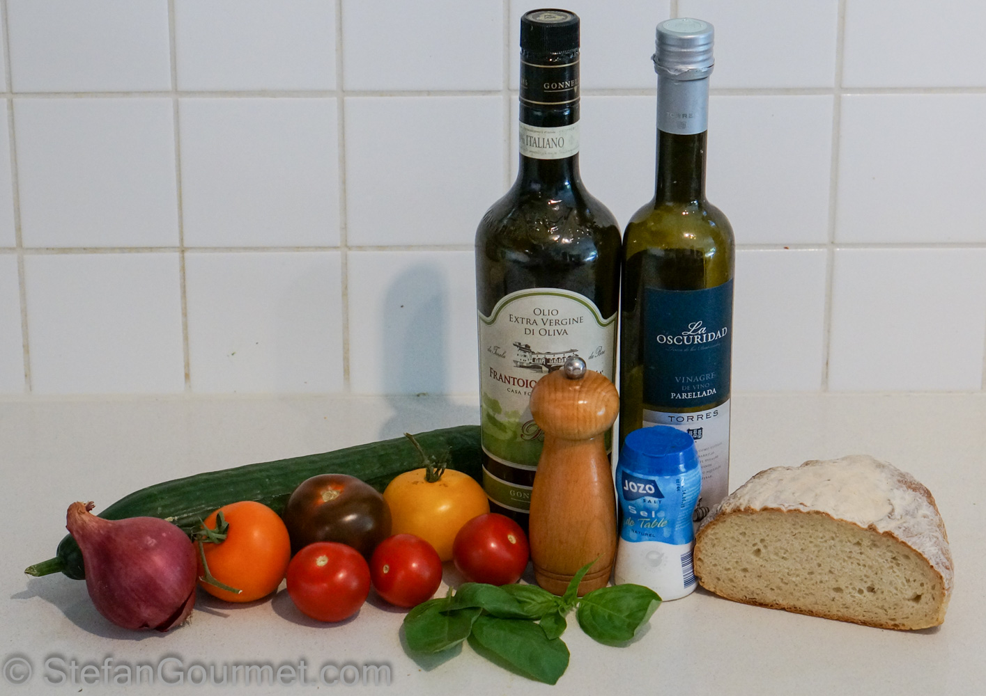 The two golden rules of Italian cooking also apply here: (1) use only the best ingredients (especially the tomatoes are important) and (2) there are as many versions of this classic recipe as there are Italians. Some people leave out the cucumber, or add olives or even anchovies. This is up to you, but if you want to keep calling it panzanella please stay within the bounds of what an Italian would use (e.g. no jalapeños or soy sauce, please). I am not providing exact amounts, as this is a dish where you eyeball the quantities. I’d recommend to have about twice as much tomatoes, cucumber and onion as bread.