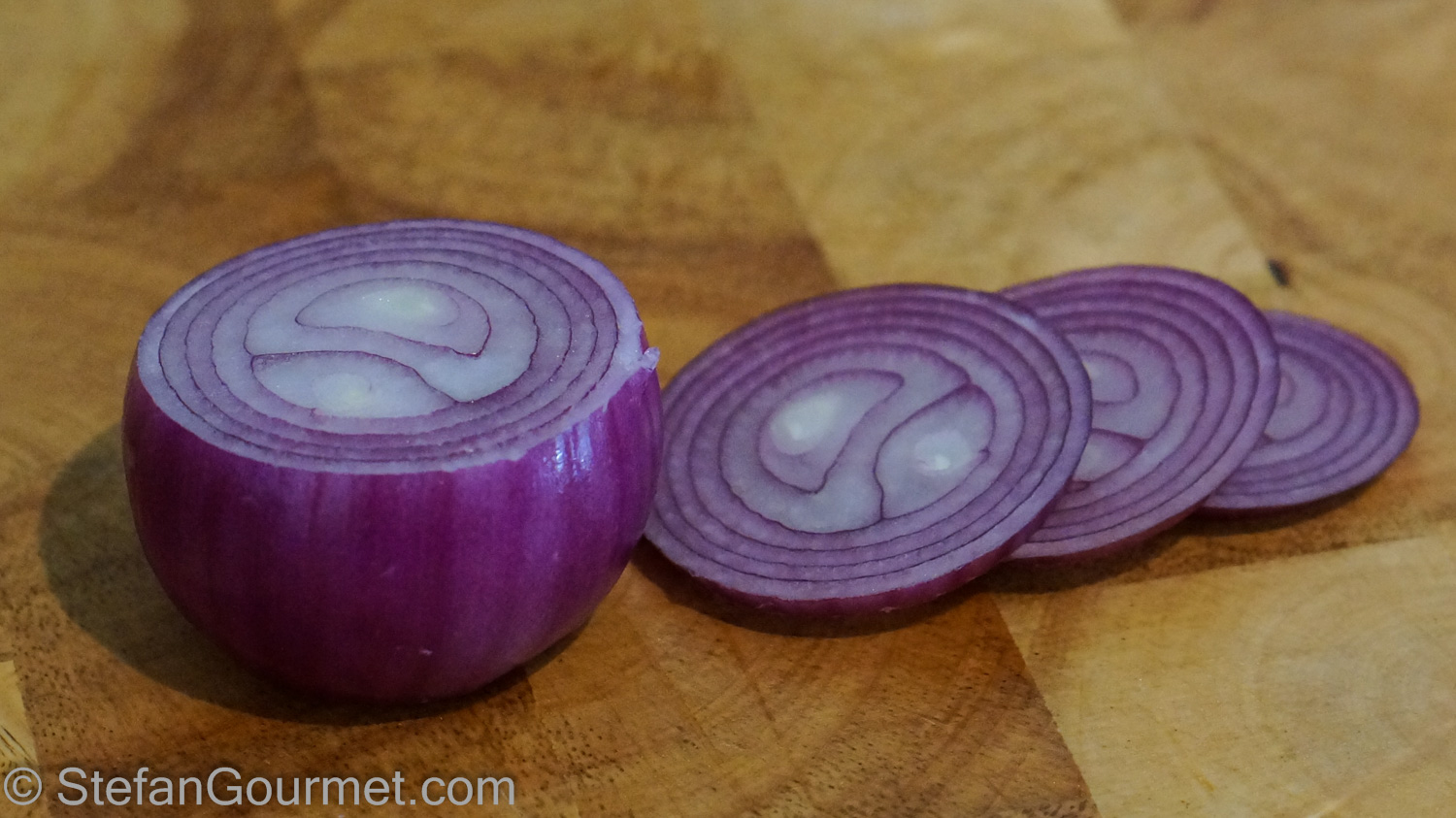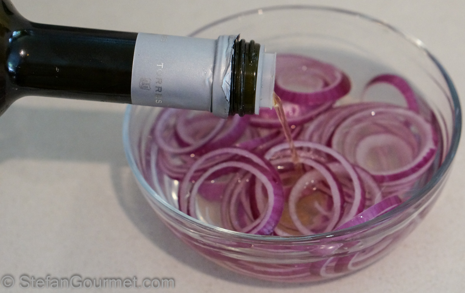 Soak the onions in water to which you have added a bit of vinegar for 2 hours to soften their flavor (optional).