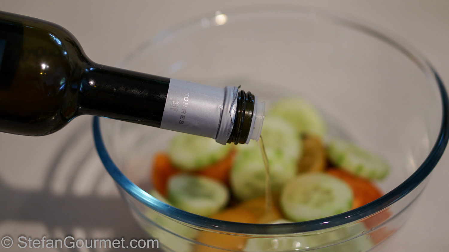 Put the tomatoes and cucumber in a bowl. Add white wine vinegar.