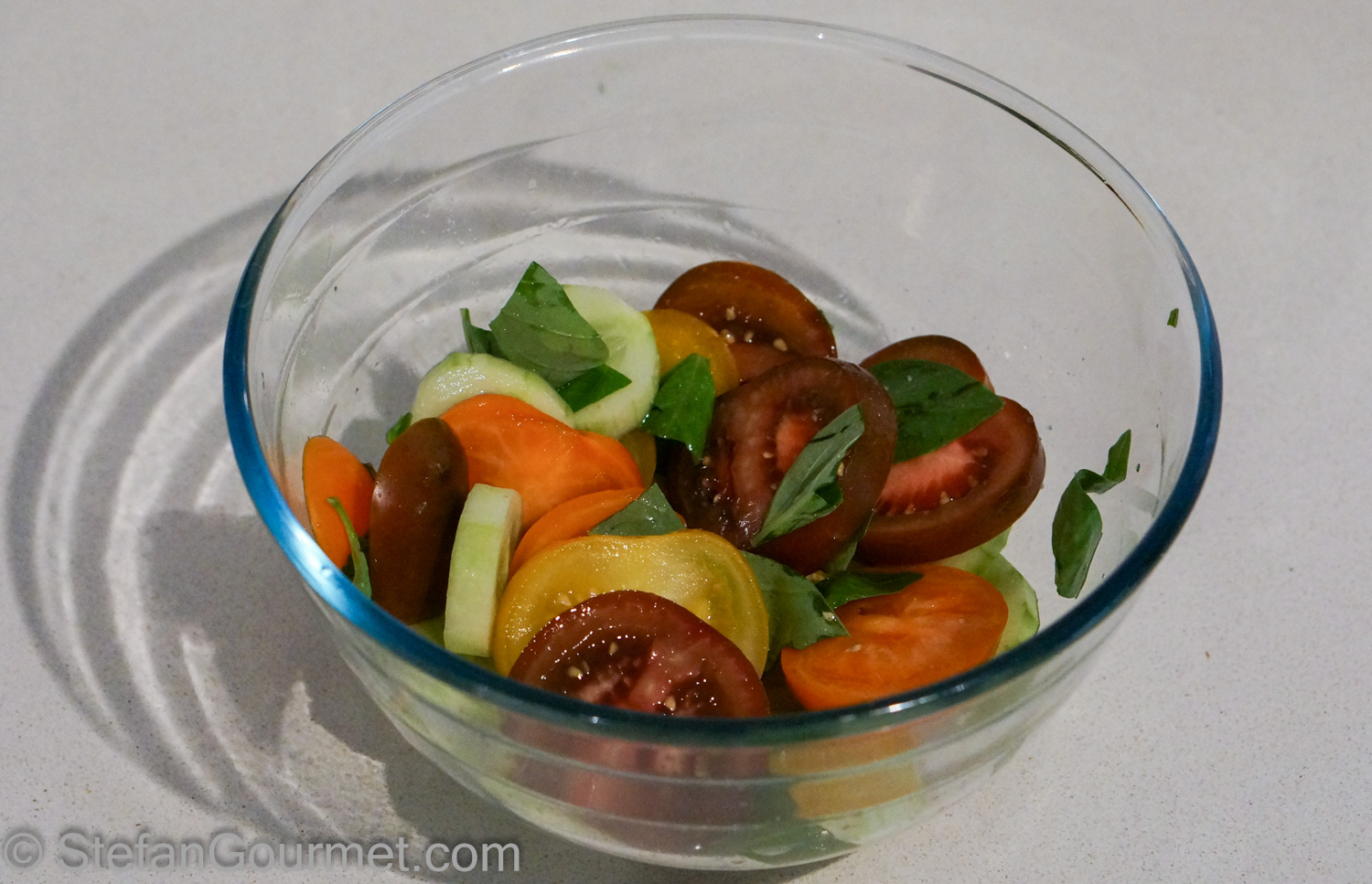 Tear the basil leaves into big pieces and add them as well. Season with salt and freshly ground black pepper. Toss to mix. The salt will draw out some of the juices and concentrate the flavor.
