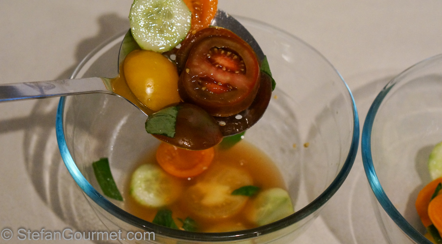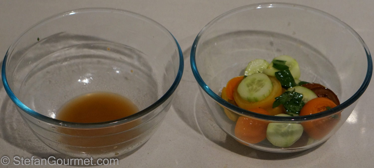 After half an hour or so, transfer the tomato and cucumber slices to another bowl with a slotted spoon.