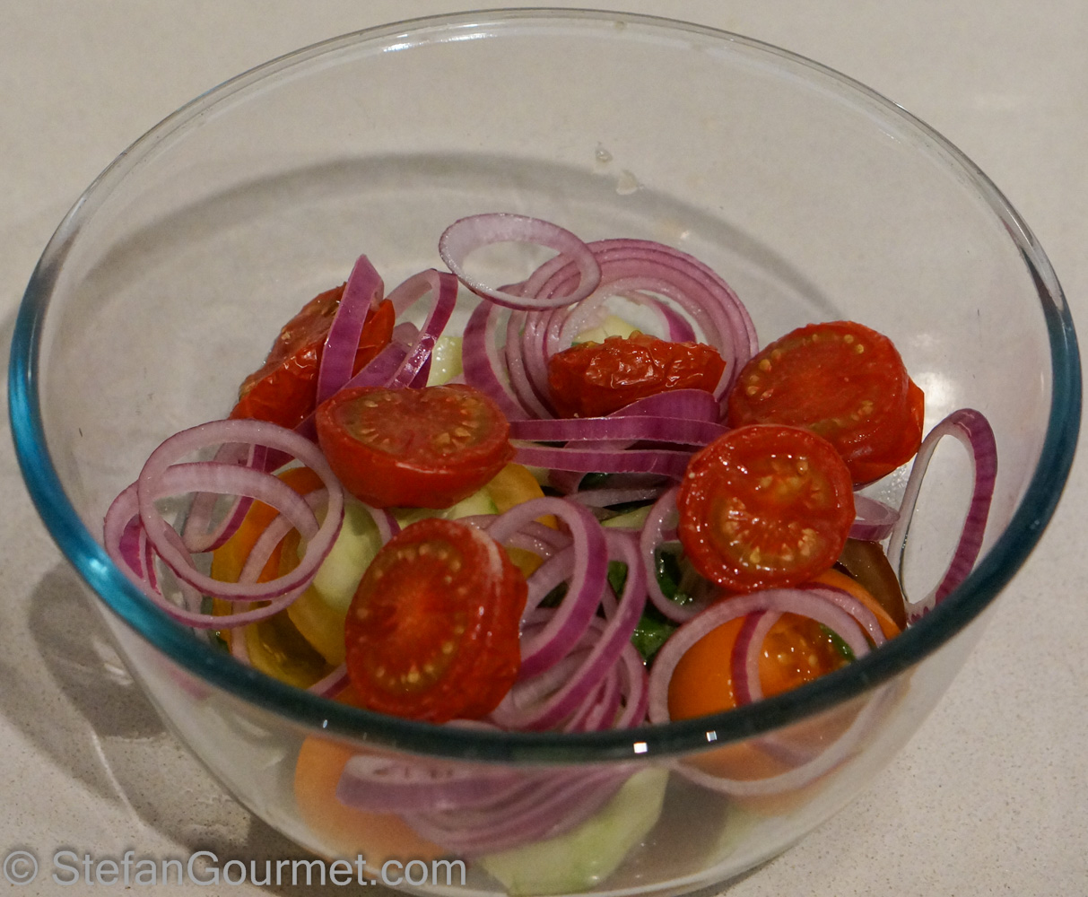 Add the onions and the roasted tomatoes to the other tomatoes and cucumber.