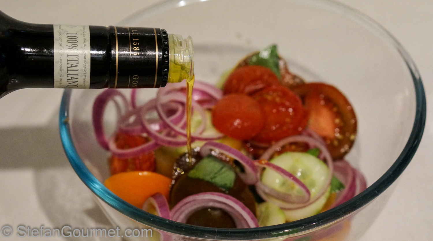 Add extra virgin olive oil and the soaked bread. Toss to mix. Taste and add more olive oil, vinegar, salt of pepper if needed.
