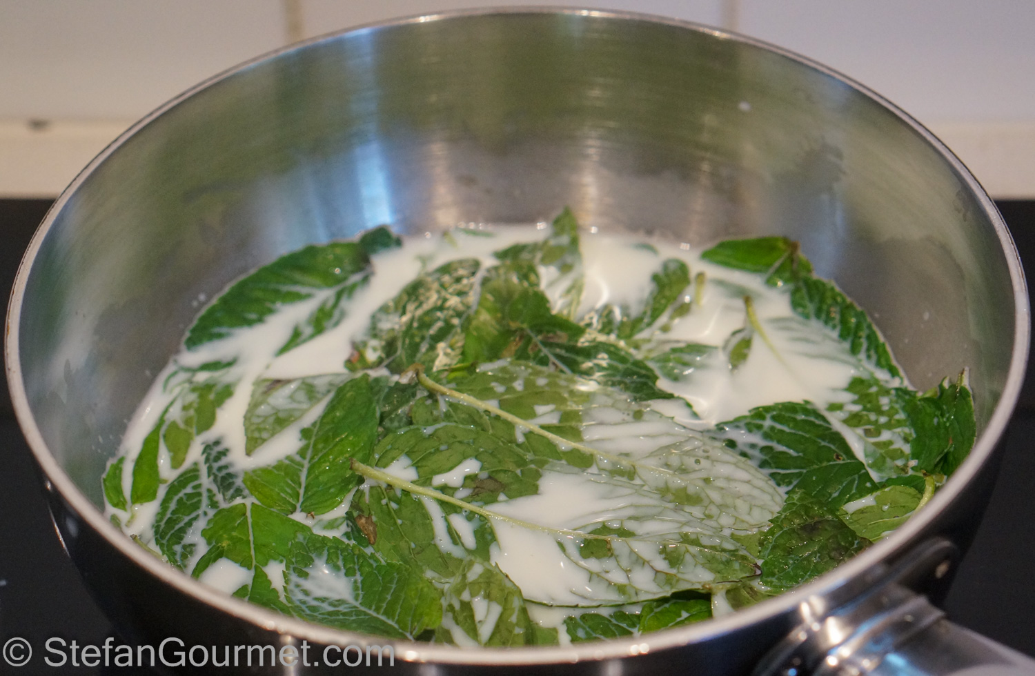 Bring to a boil and then turn off the heat. Allow the mint leaves to steep in the hot milk for 10 minutes.