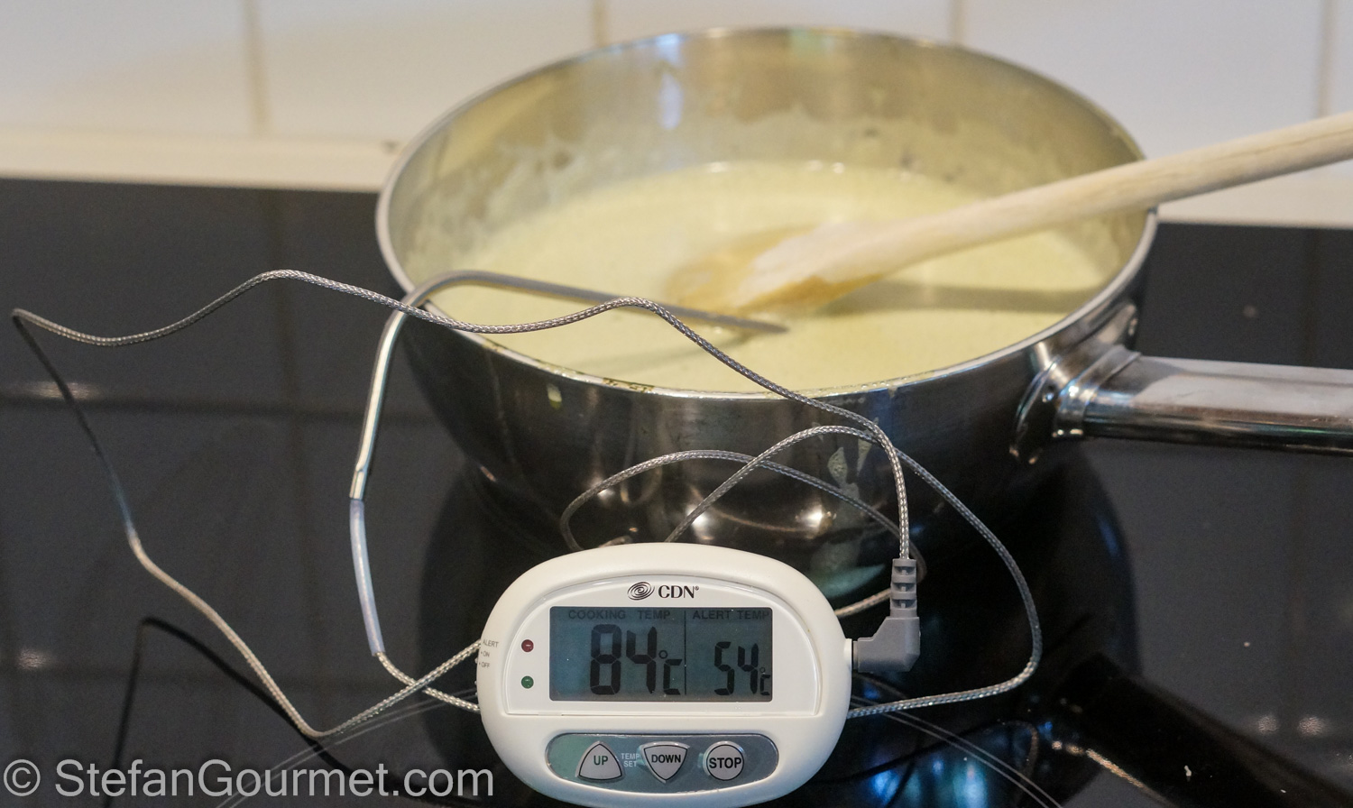 It is a certain thickness, which happens to be reached at that temperature because that is when the proteins in the milk change shape. By using the thermometer I can use higher heat in the beginning and thus work more quickly.