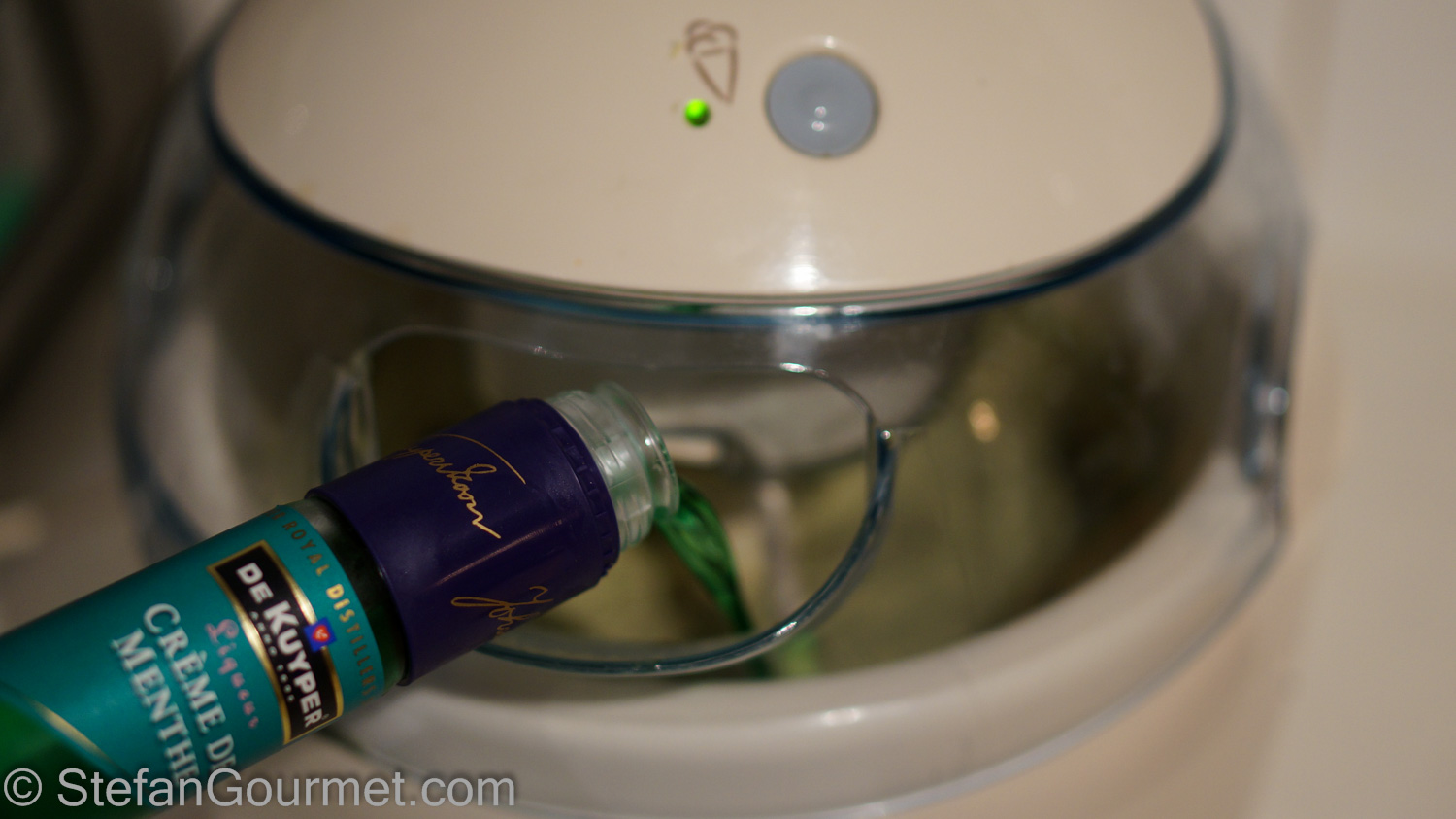 Add the creme de menthe. This has a double purpose: it boosts the mint flavor, and it helps the ice cream to stay slightly soft.