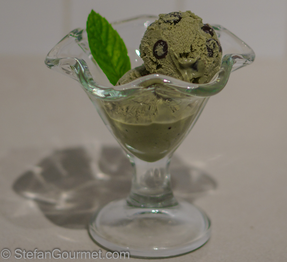 Tried it twice and it is a stunner! Second time I left the mint in the milk overnight but no difference. 8 people tasted the ice creams and the opinion on the chocolate is varied: too much/little chocolate, too edgy, too minty/ brilliant (the second time I used mint infused chocolate, frozen and then cut in very small but admittedly sometimes edgy pieces, which gives another powerful kick). I’m considering serving it with a chocolate sauce (remember Dame Blanche?). Everyone can control the cream/chocolate ratio and it is smooth, just as the ice cream.
