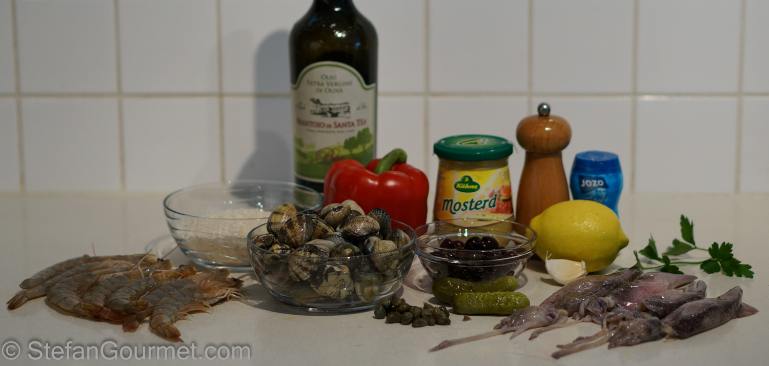 The recipe below is just a suggestion, change it according to what is available and your personal preference. As with most Italian recipes, it is not the cooking but acquiring the best ingredients that is most important. It is not a good idea to cut down the amount of cooking even more by purchasing seafood that is already cooked, as using fresh seafood is key to making this a great salad. Using frozen raw shrimp and frozen raw squid is acceptable, but does impact the flavor. Taggiasca olives are small black olives from Liguria that have much more flavor than regular black olives. Try to find them, you may even like them if you are usually not that fond of olives.