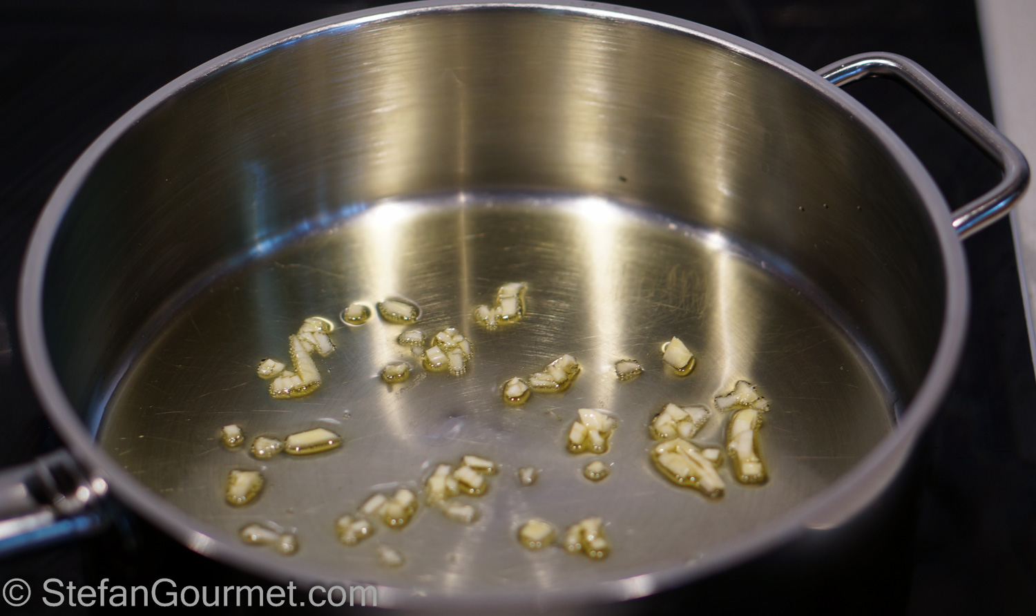 Heat a tablespoon of olive oil in a frying pan over high heat. Add the garlic.