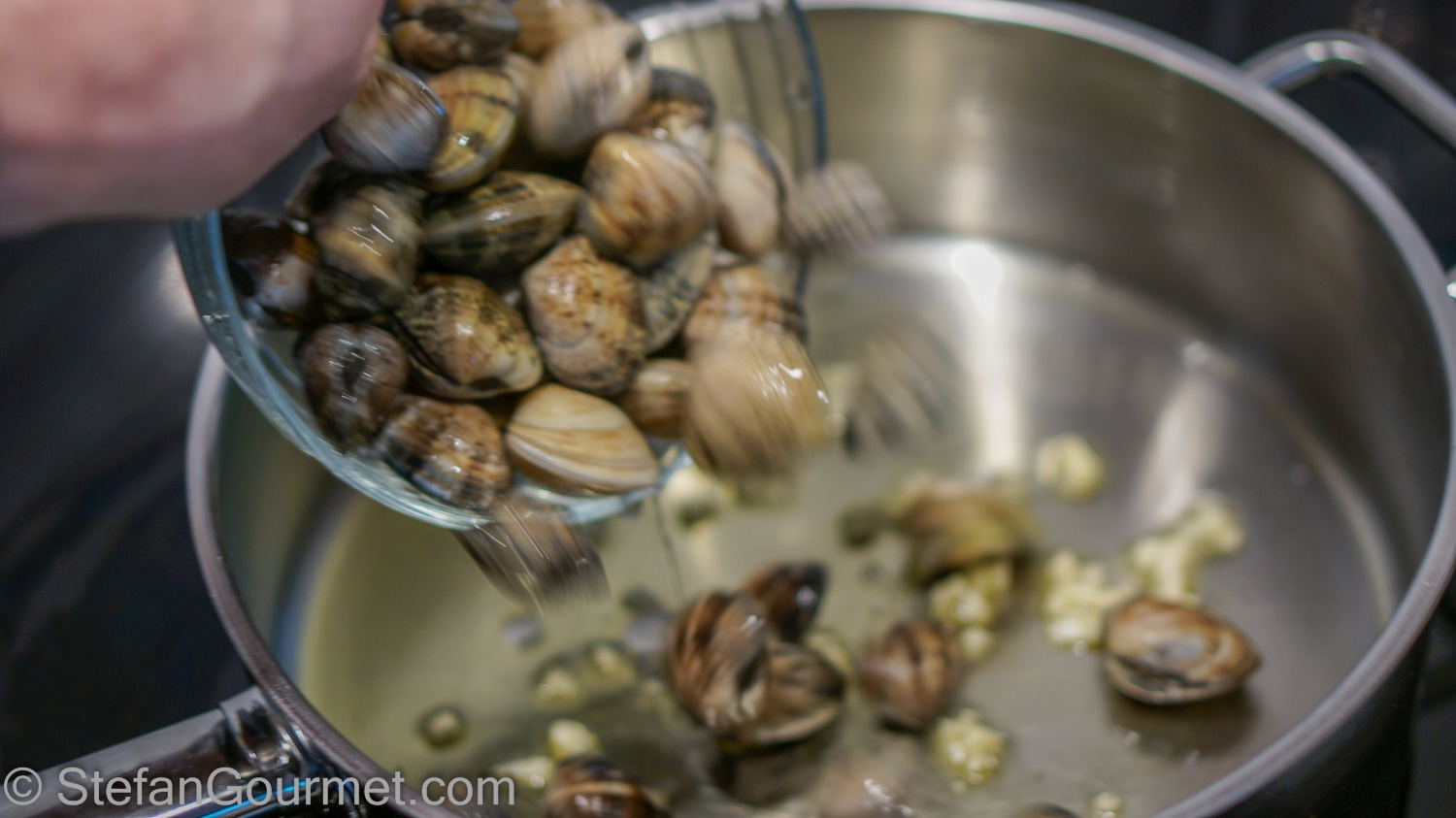 Immediately add the clams before the garlic burns.