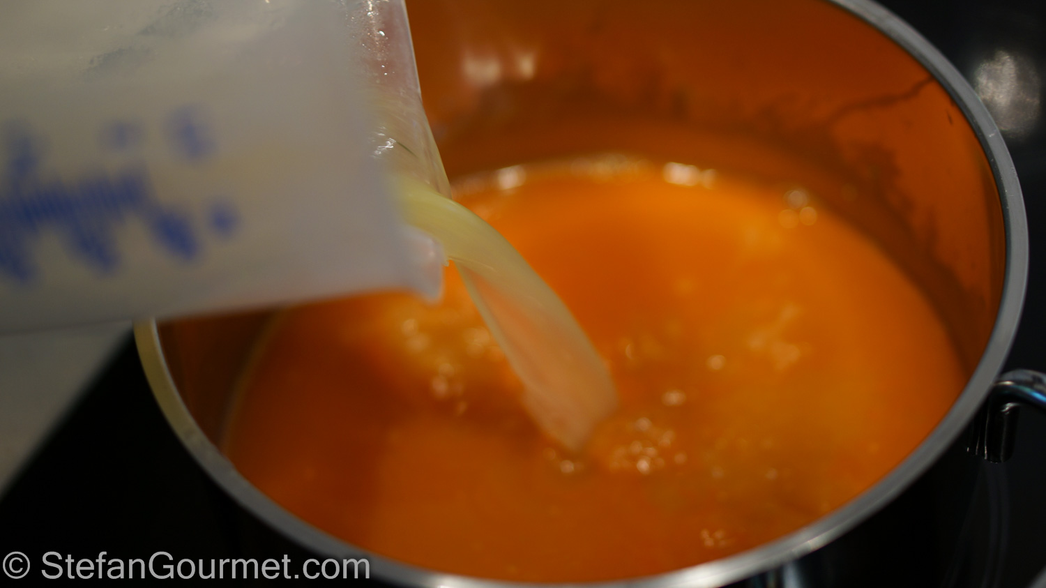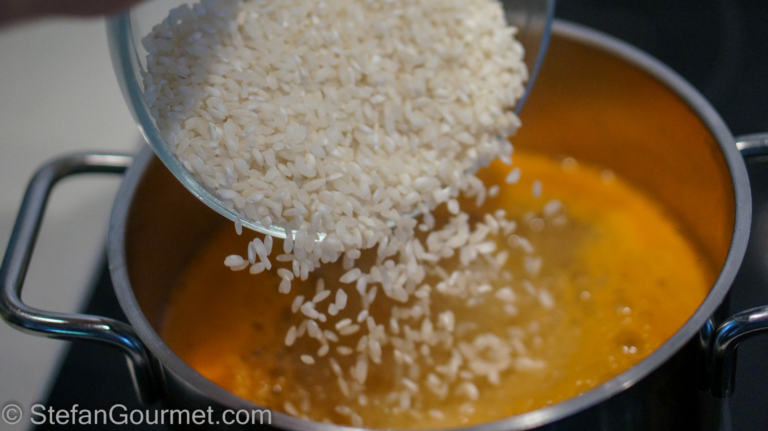 When the seafood stock or water boils, add the rice.