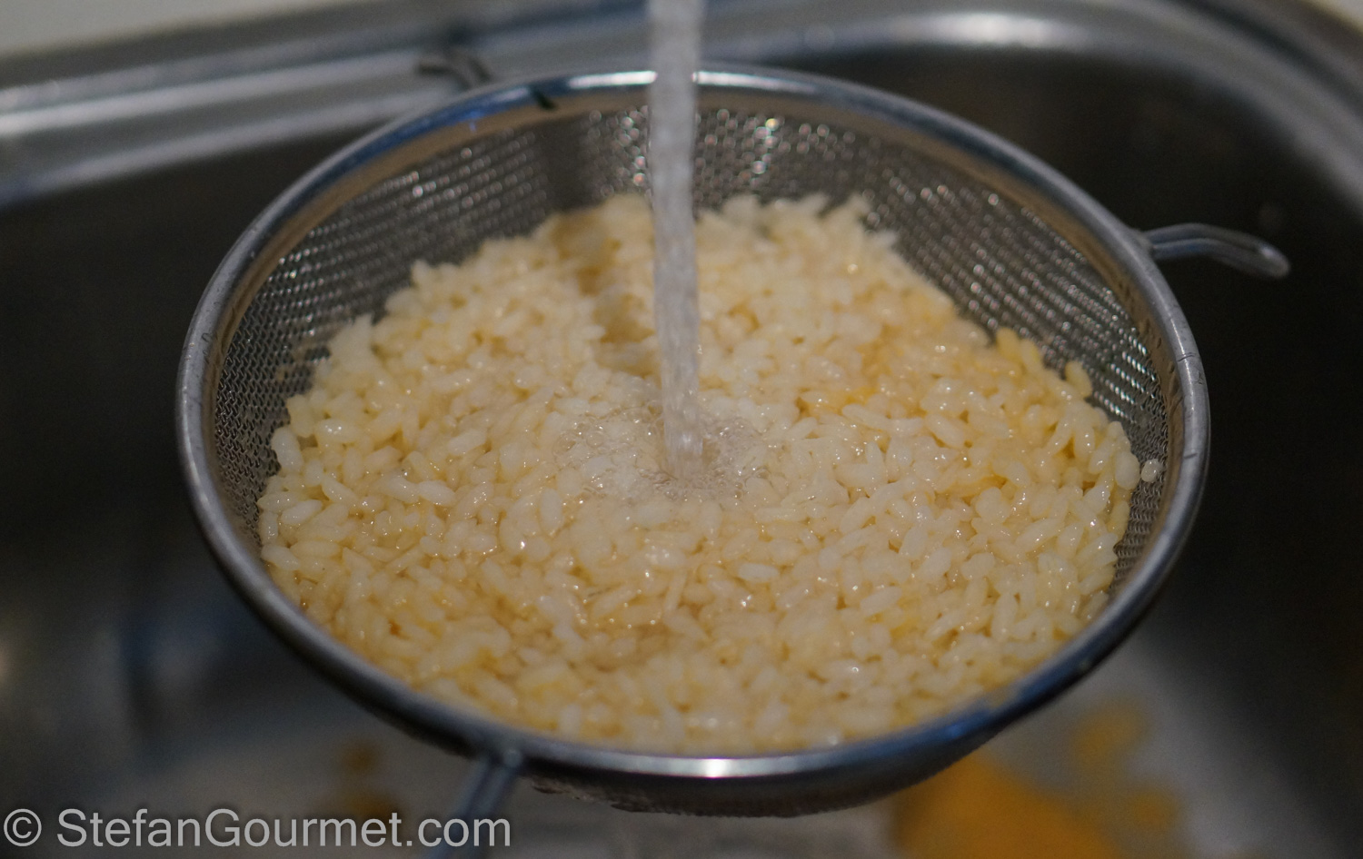 Rinse the rice with cold water to wash away the starch and cool it down quickly — unfortunately this also washes away a lot of the seafood flavor imparted by cooking in the seafood stock.