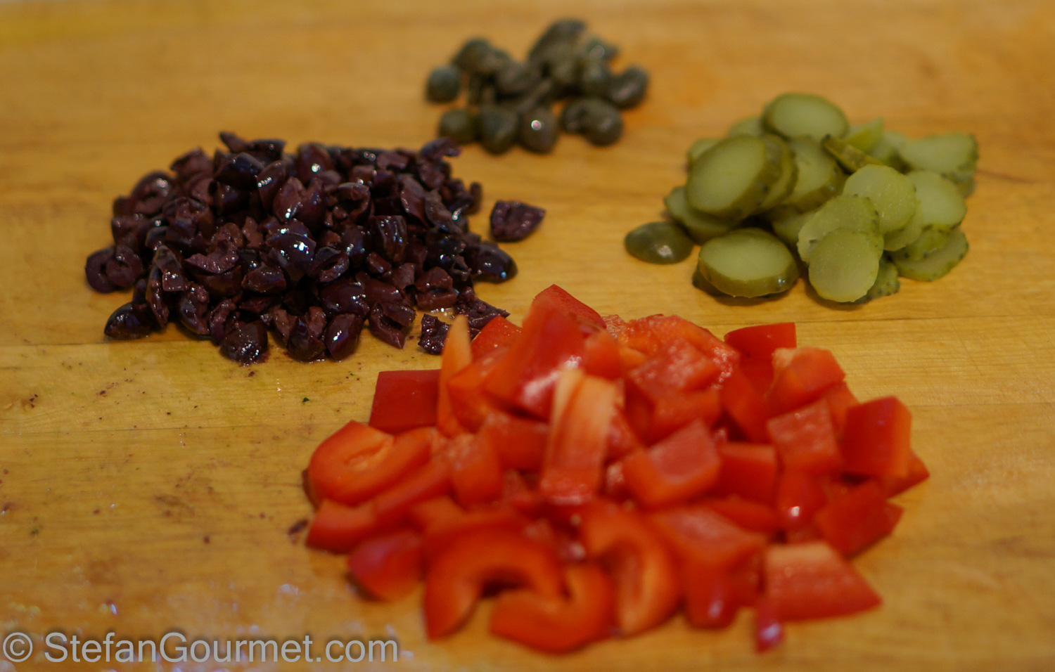 Cut the olives into quarters, dice the red bell pepper, and slice the gherkins.