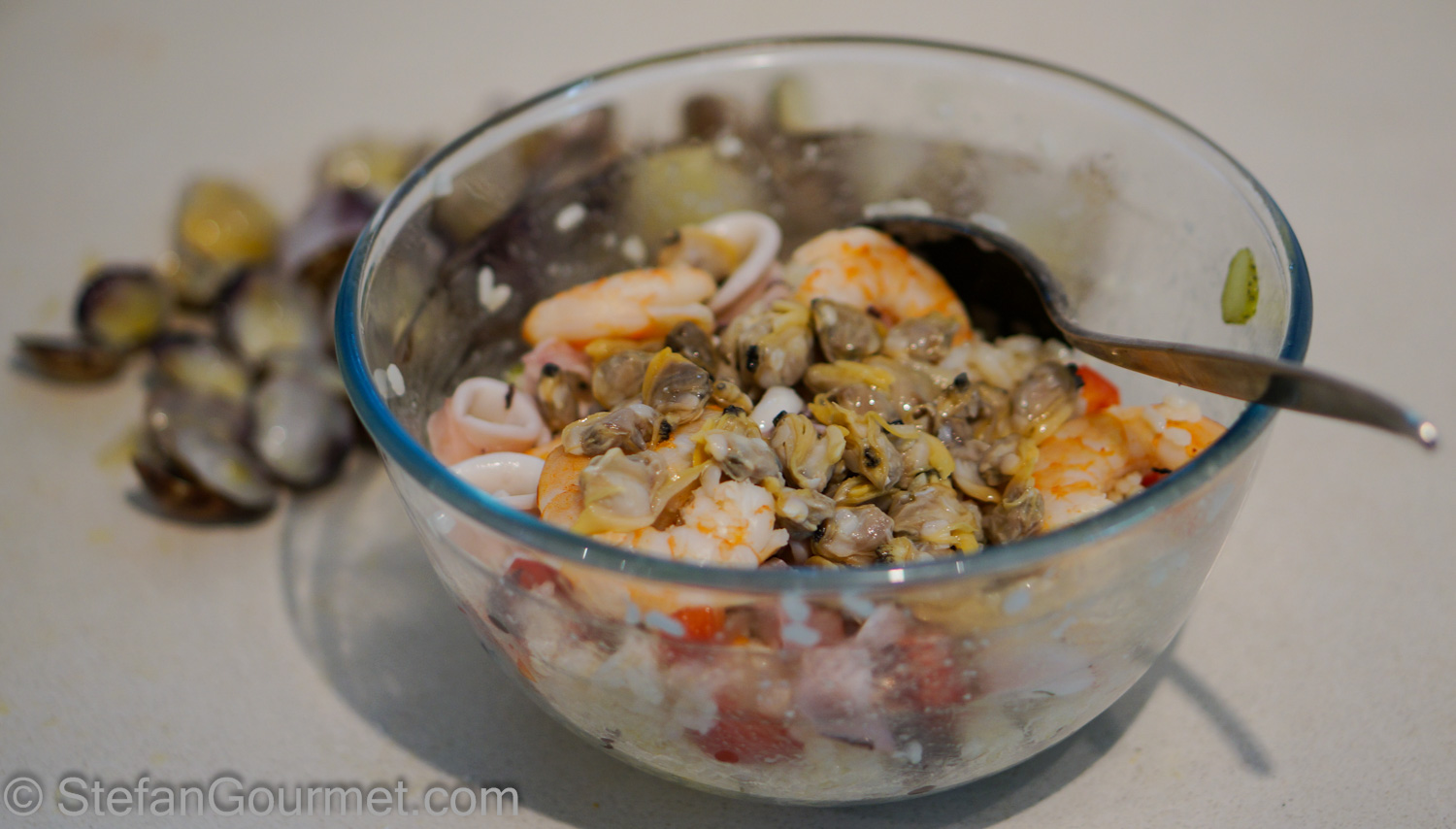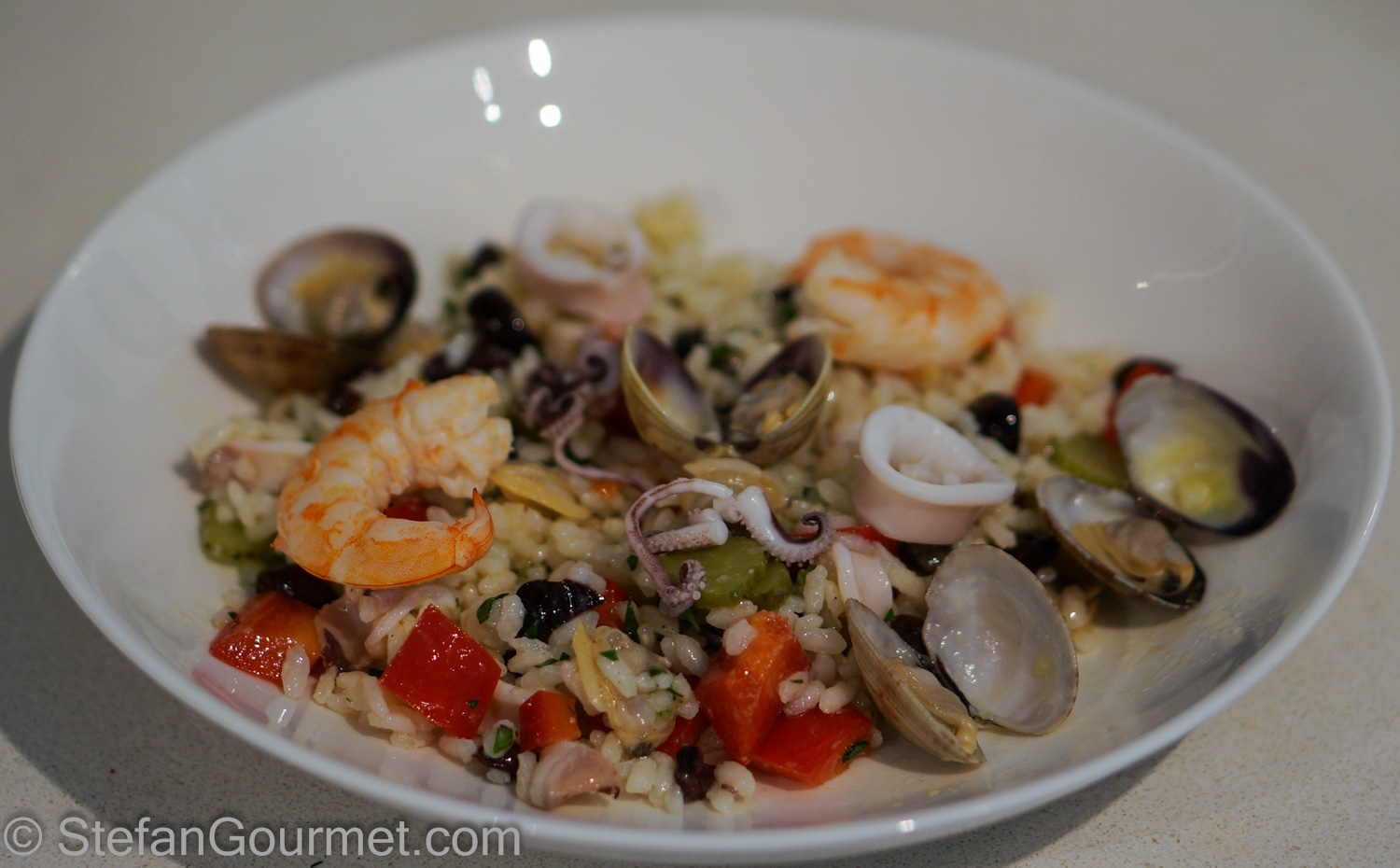 Put the rice in a bowl together with the olives, bell pepper, capers, and gherkins. Take the clams out of their shells (reserve a few in their shells for plating) and add them to the rice, together with the shrimp and squid.