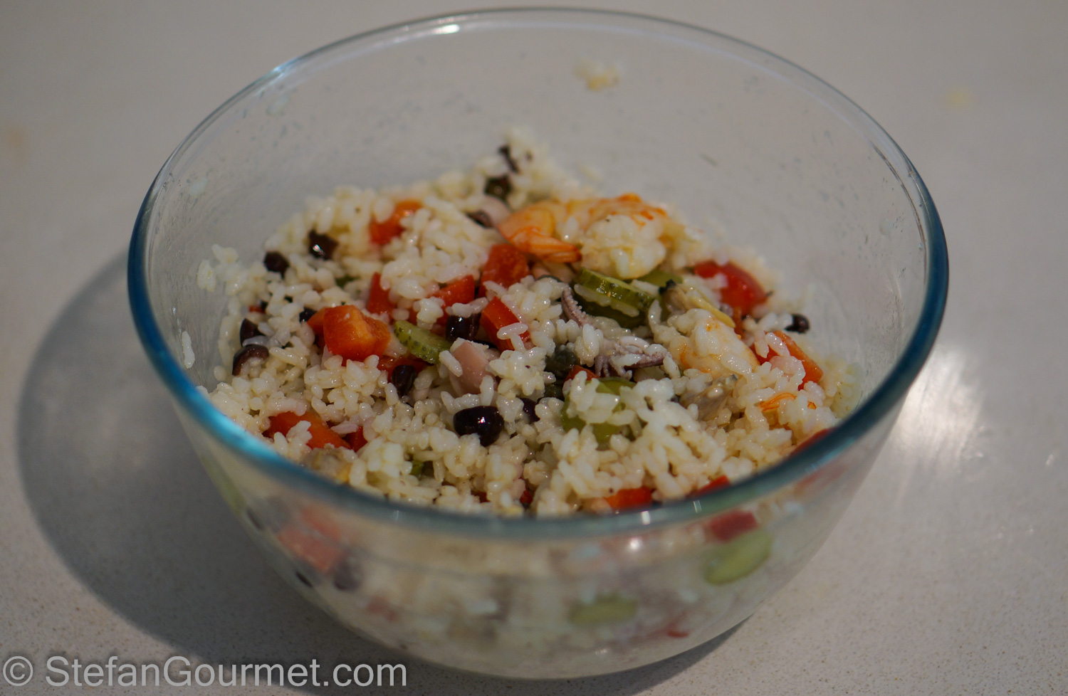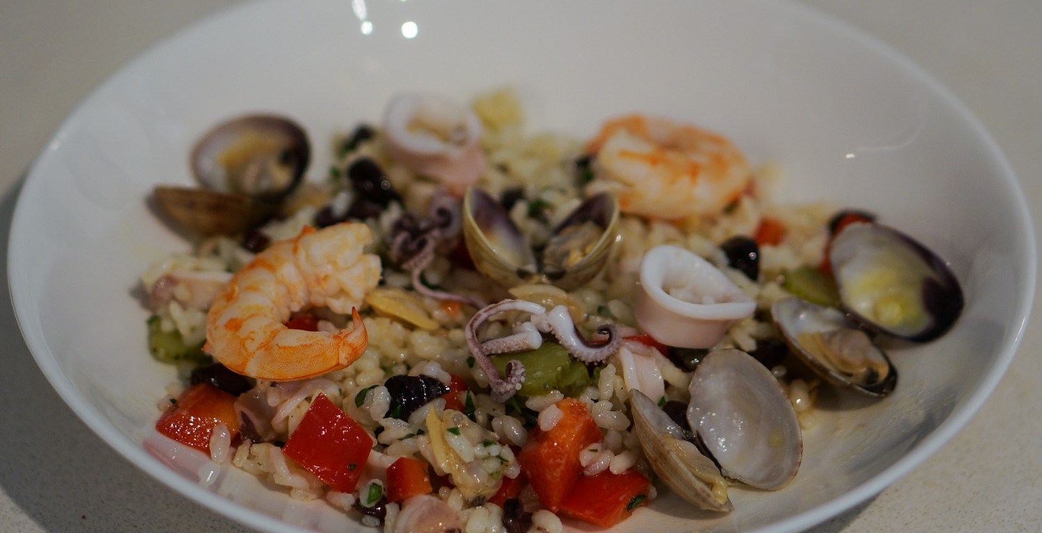 This rice and seafood salad is nice when served slightly chilled.