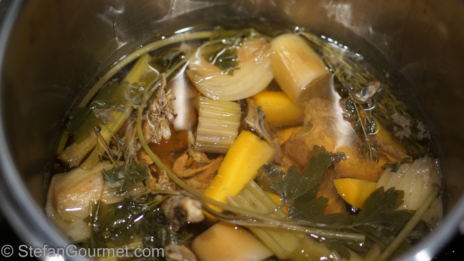 Simmer the stock until it is reduced to about 10% of the original volume, stirring now and then.