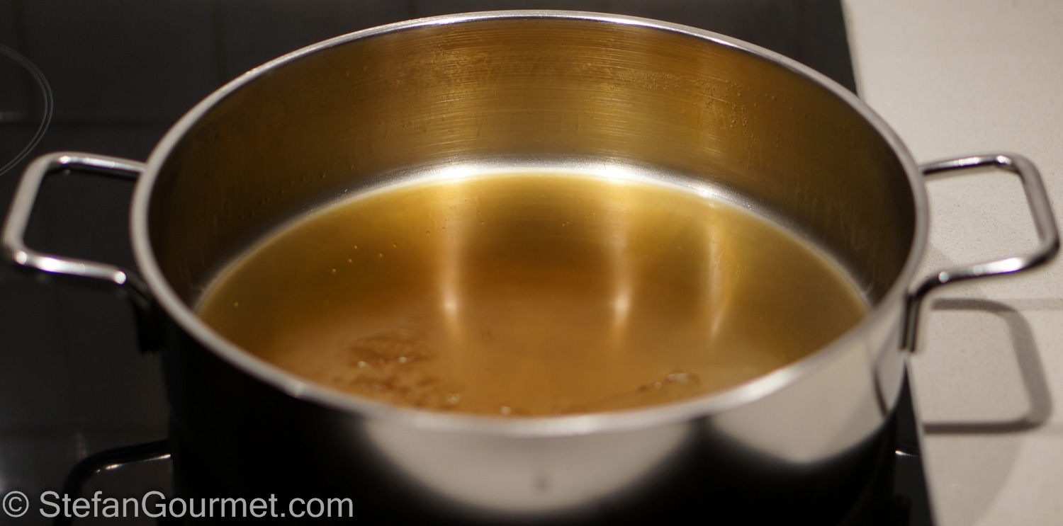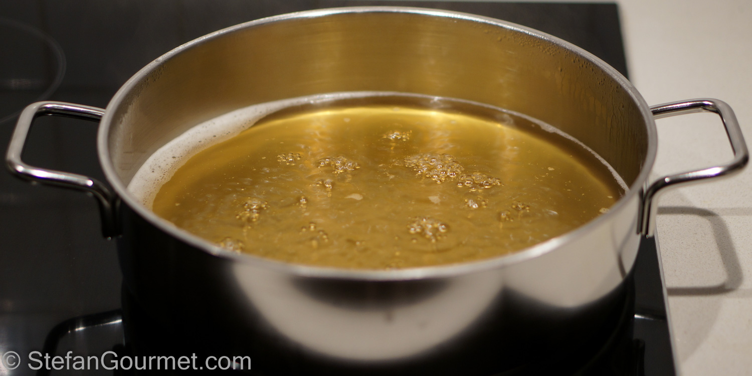 Sieve the stock and put it in a wide pan. Bring to a boil and reduce the heat such that it simmers.