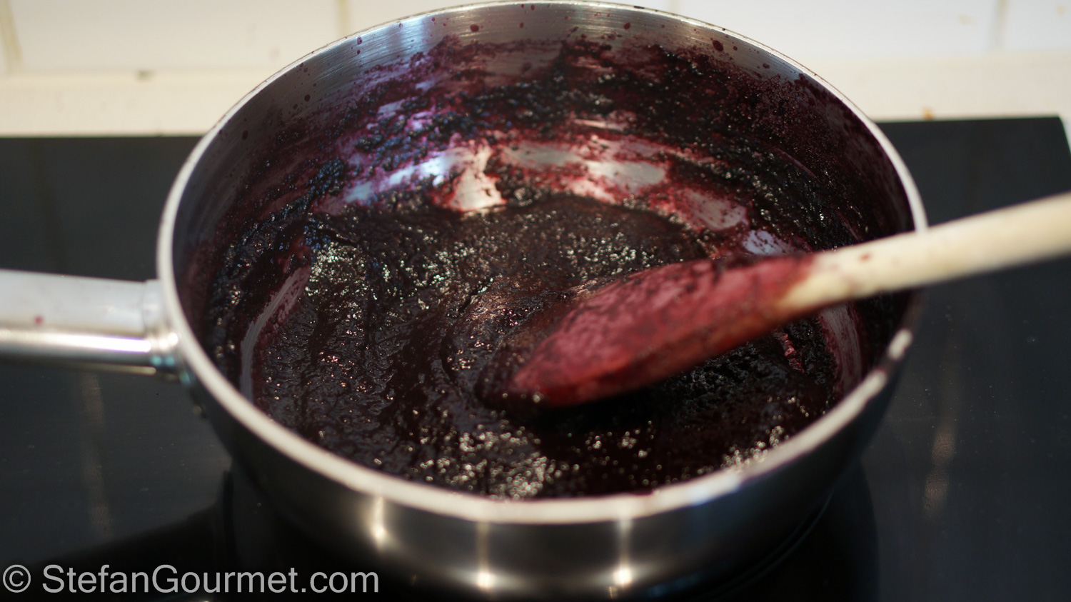 Reduce the heat and simmer the cherries, stirring now and then, until thick.