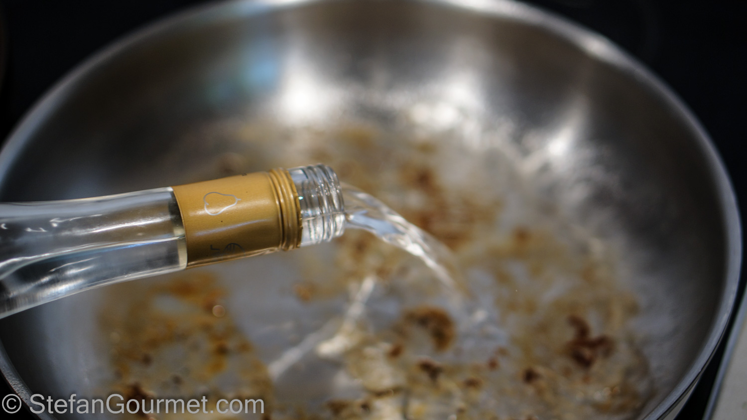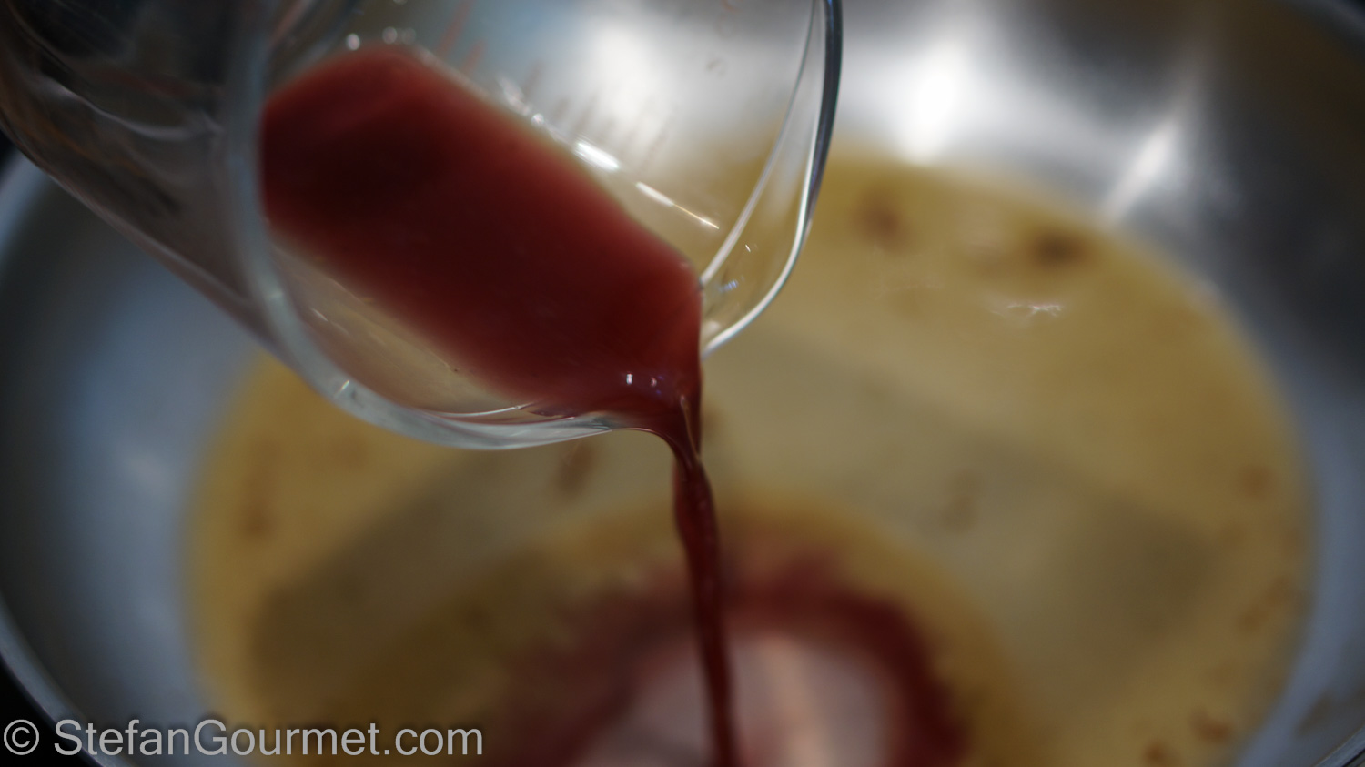 Take out the pigeon pieces and deglaze the pan with the Kirsch. Keep the pigeon pieces warm by wrapping them in aluminum foil.