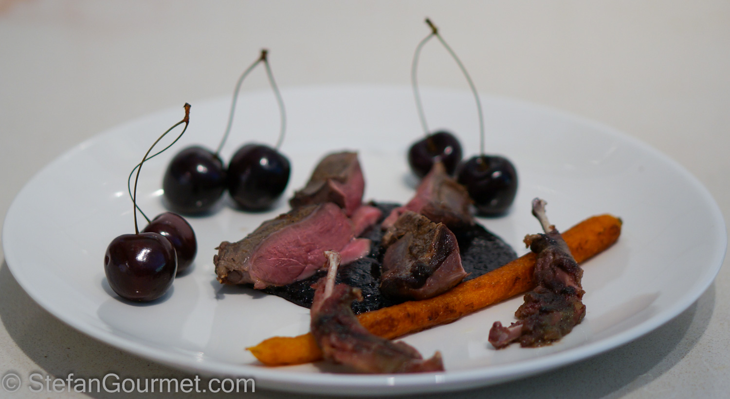 I love cherries with anything strong and meaty. Recently, I did a cherry sauce with pork loin and 5 spice. This worked well. However, it is a far more rustic production than this. Very nice indeed.