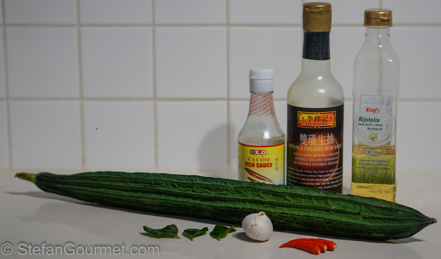 In Thai it is called “buap liyam” or “buap liam”, and I decided to prepare it stir fried as I think a Thai might do it. (Miranti, please feel free to comment.) Loofah is very good at picking up other flavors such as garlic, chili pepper, soy sauce, and fish sauce. It has a slightly sweet flavor and a crunchy texture on the outside while the inner part is more tender. It worked very nicely with the lime leaf chiffonade. I really enjoyed it and will definitely prepare it again. Here’s what I did.