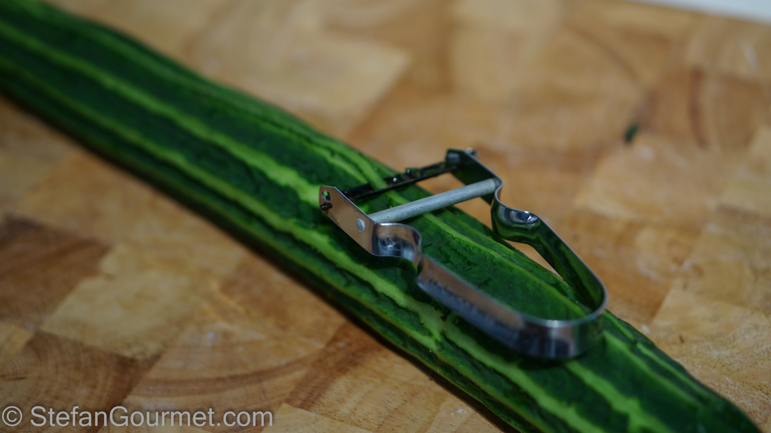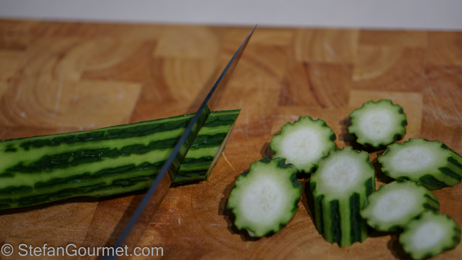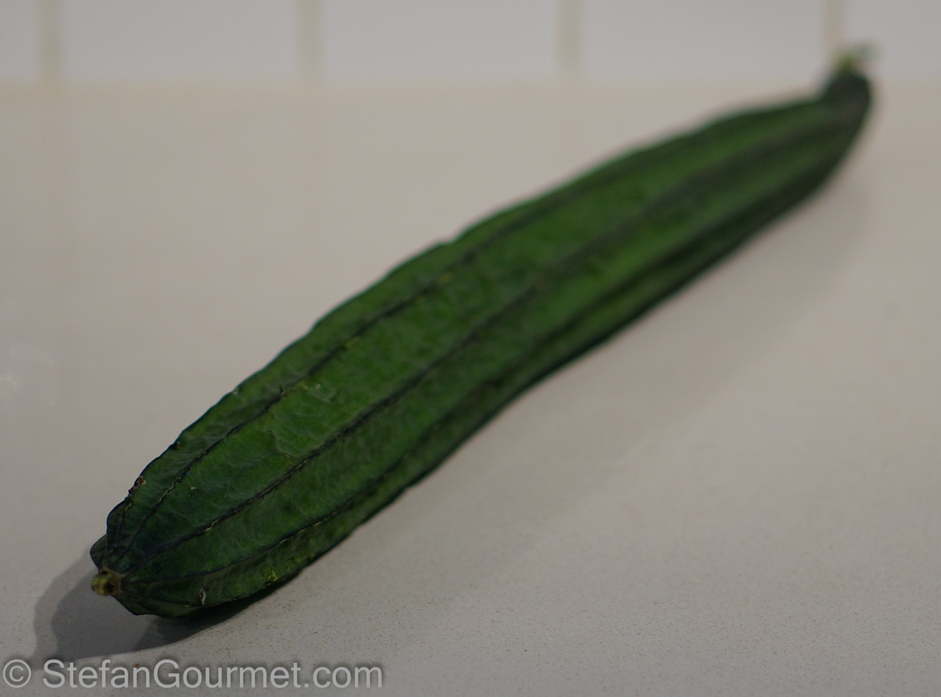 I was feeling adventurous at the Asian market and bought this vegetable that I had never seen or heard of before. It looked like a cucumber with ridges and the sign said “terroi”. When I googled that on my phone, I got no hits whatsoever. As I was feeling adventurous, I bought it anyway and asked a salesperson how to prepare it. She told me in soup or stir fried. Then on the receipt it was listed as “Terroi / Sie kwa”, and that second name was the key to finding out that this is called “angled loofah” (or “luffa”) and is indeed eaten stir-fried or in soups in Chinese cuisine. I only knew the word “loofah” as a cleaning sponge, but the unripe version of the fruit is apparently eaten all over Asia. According to Wikipedia, other English names for it are “Chinese okra, dish cloth gourd, ridged gourd, sponge gourd, vegetable gourd, strainer vine, ribbed loofah, silky gourd, ridged gourd, silk gourd”. In Hindi it is called “torai” or “turai”, so that is most likely why it was listed as “terroi” at the Chinese market.