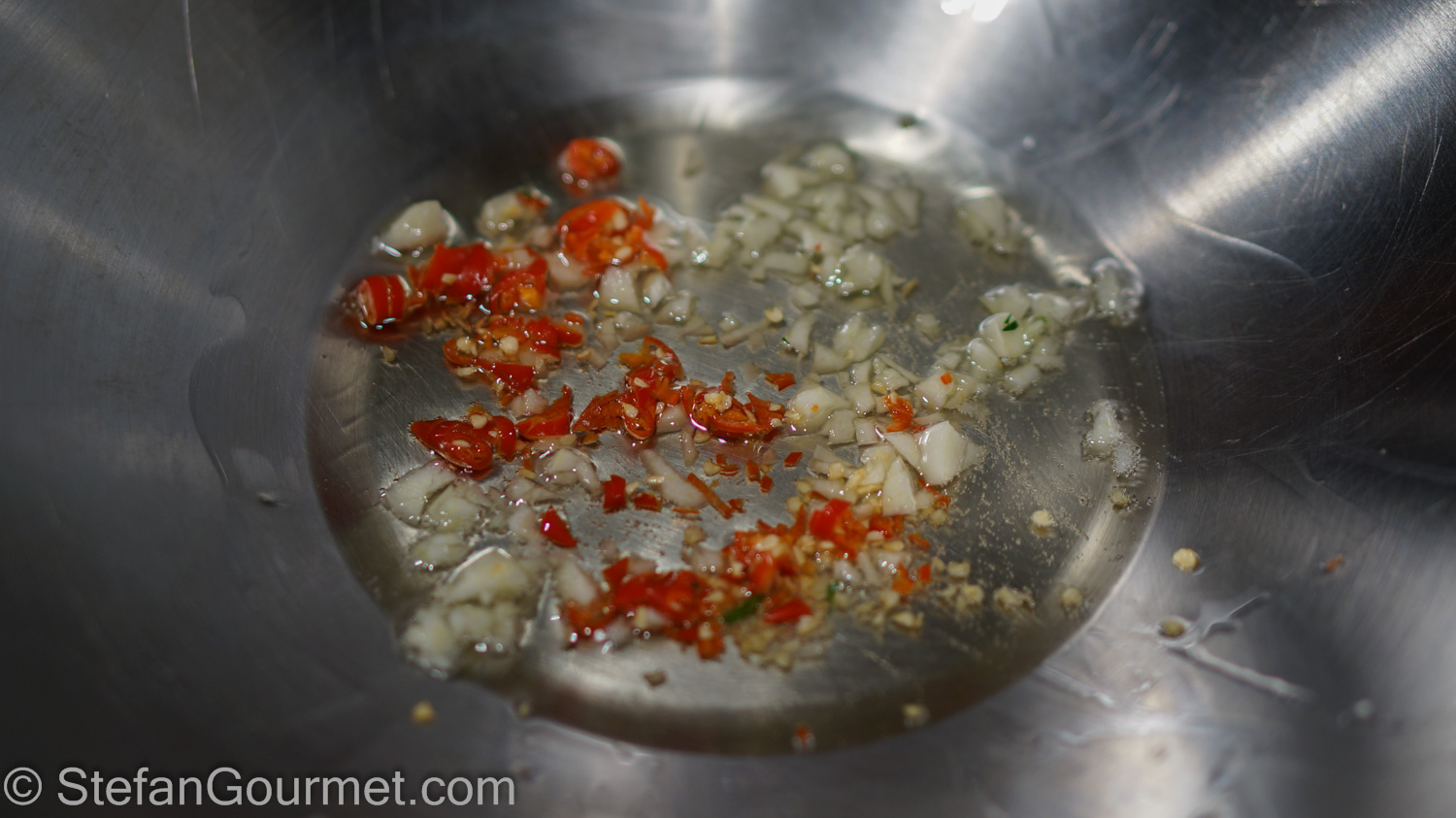 Heat the oil in a wok. Add the garlic and chili pepper and stir fry for a minute.