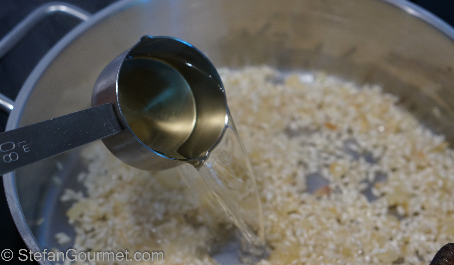 Add the white wine and cook over medium heat until the wine has almost completely been incorporated into the rice.