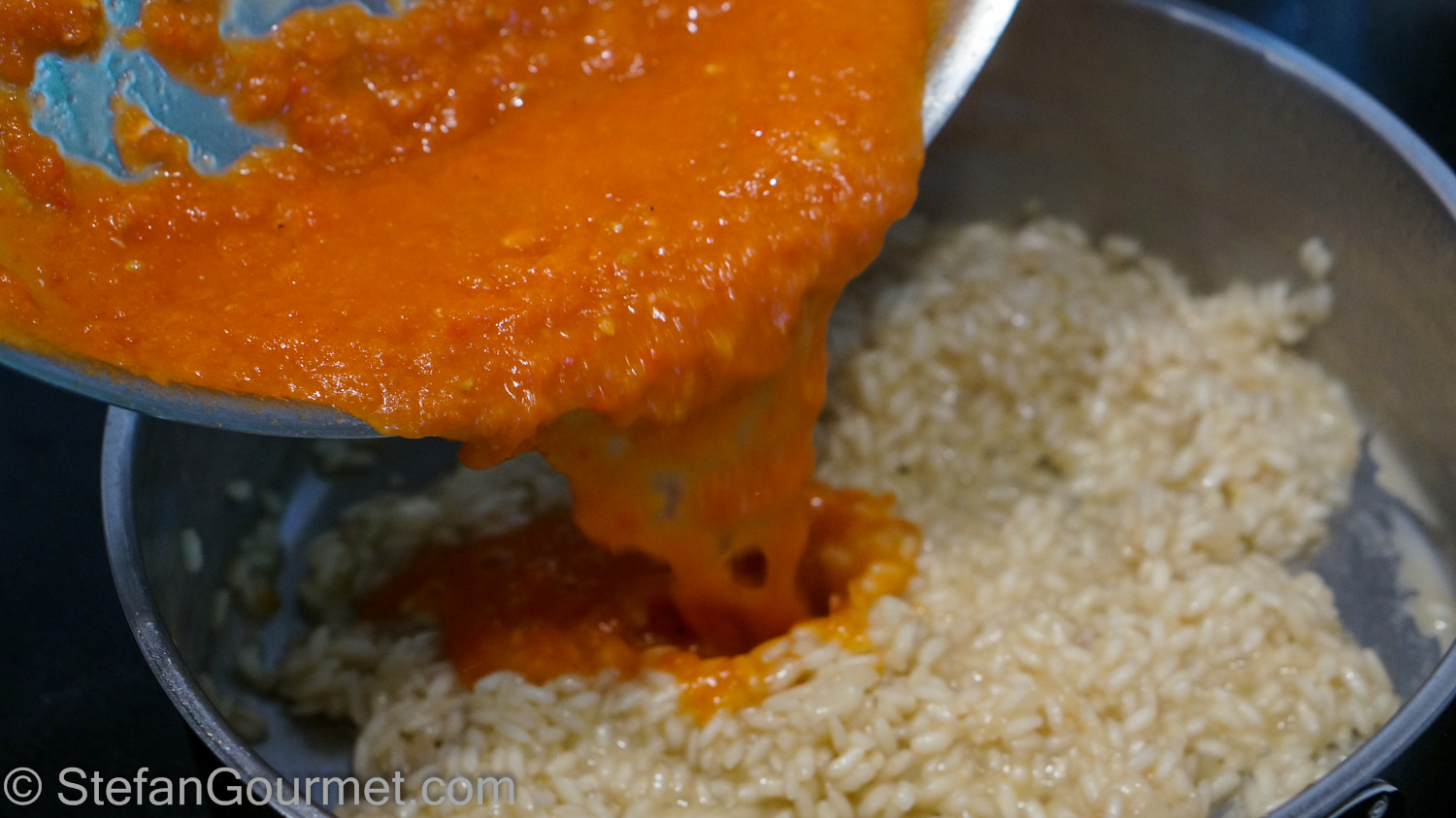 Add the tomato sauce, now enriched with fish juices, to the rice.
