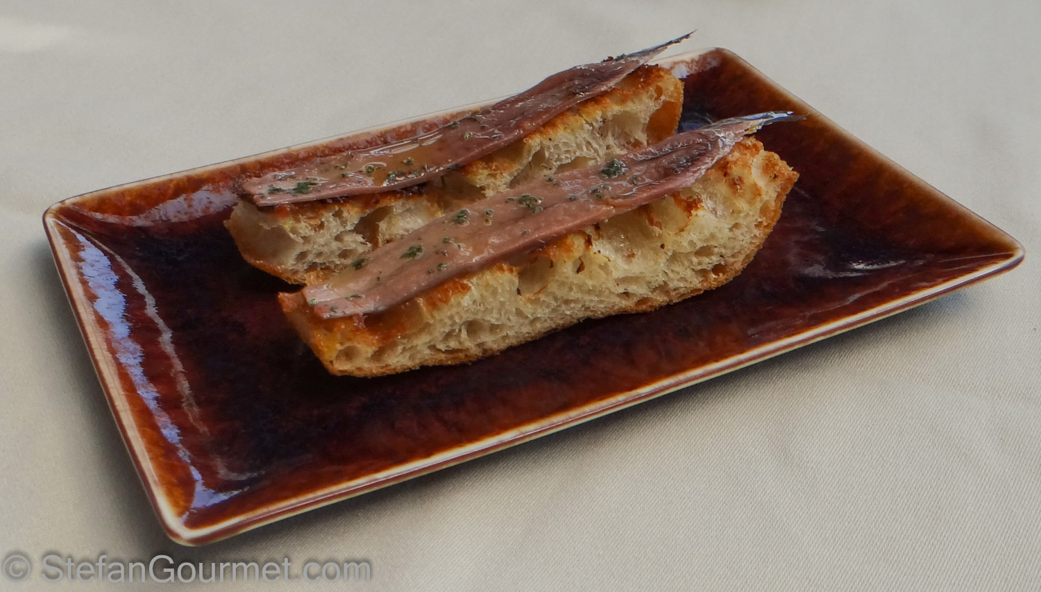 The anchovies, obviously salted at the restaurant, served on toasted bread.
