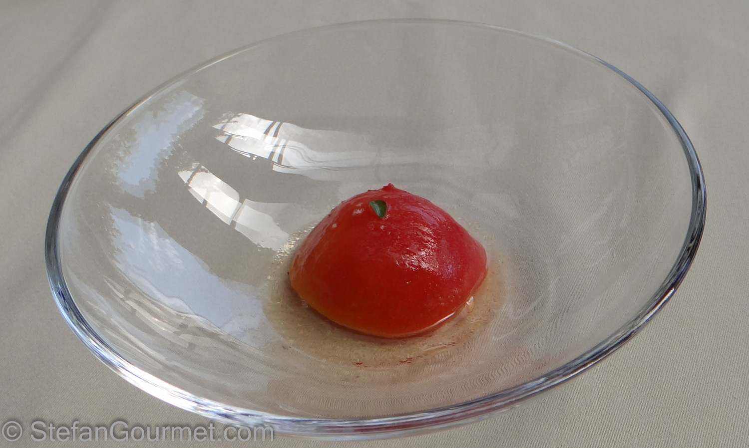 Simply a tomato, with nothing else (apart from a tiny leaf as decoration) had a wonderful tomato flavor. It had only been skinned.